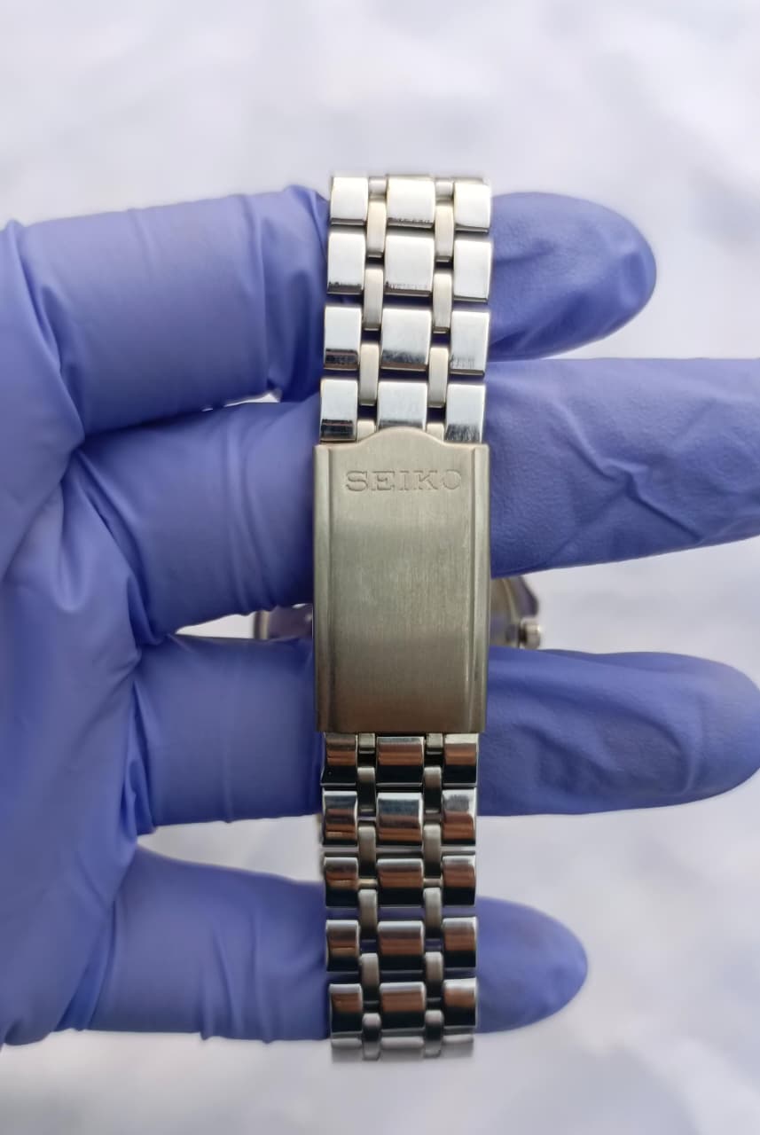 This is a distinctive and eye-catching Seiko 5 Automatic 21 Jewels men's watch, a classic model renowned for its reliability. It showcases a beautiful, vibrant teal/light blue dial with bold Arabic numerals and a day/date window featuring the day in both English and Arabic script, making it a unique piece.