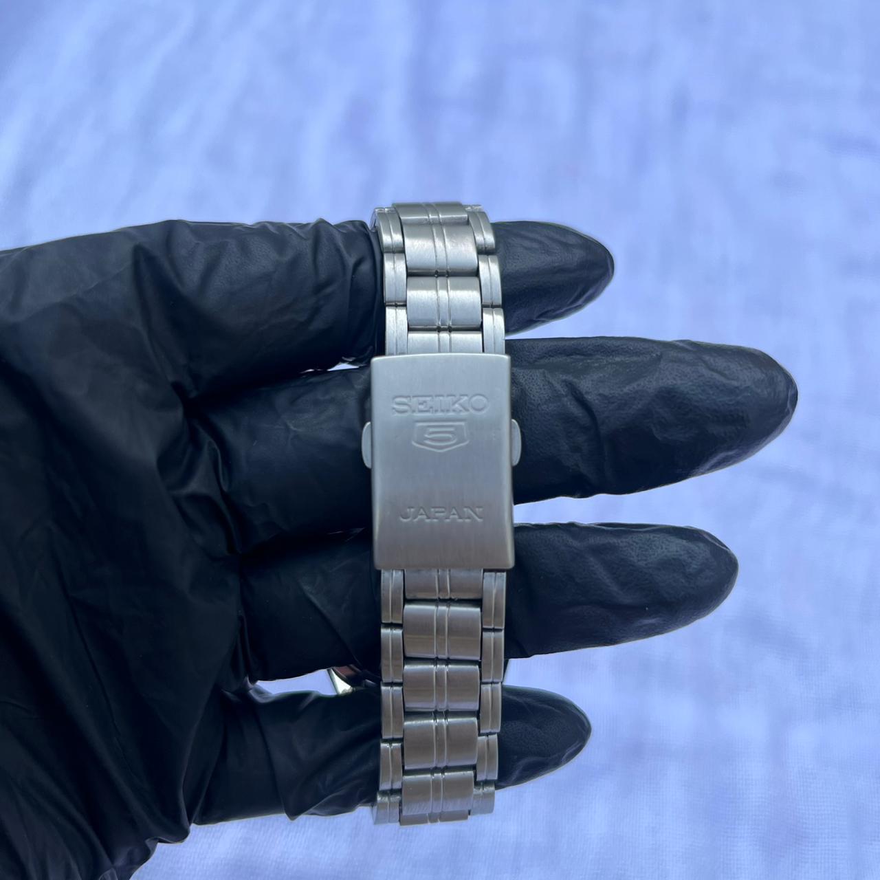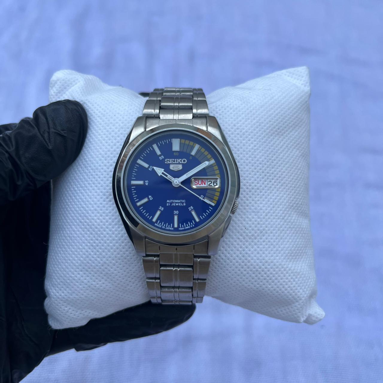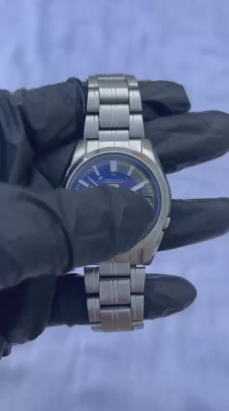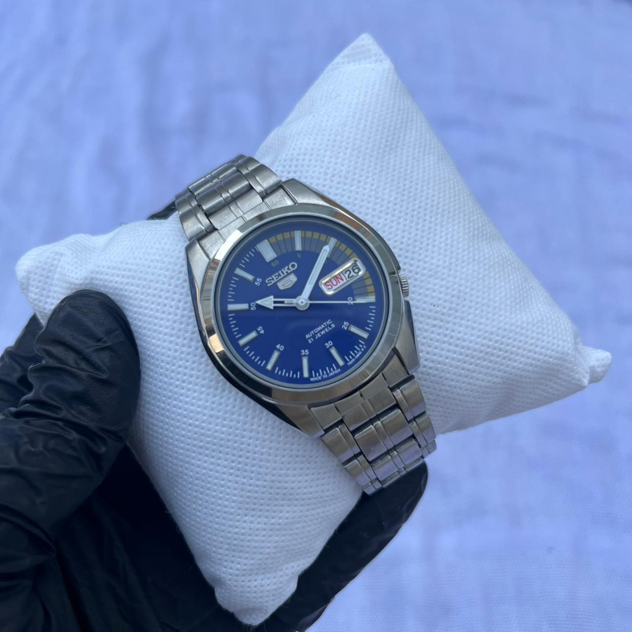 This is a dynamic and eye-catching Seiko 5 Automatic men's watch, featuring a vibrant blue sunray dial with a unique two-tone minute track. Its sporty yet classic design, combined with a robust stainless steel construction, makes it a highly versatile timepiece for collectors and daily wearers alike.