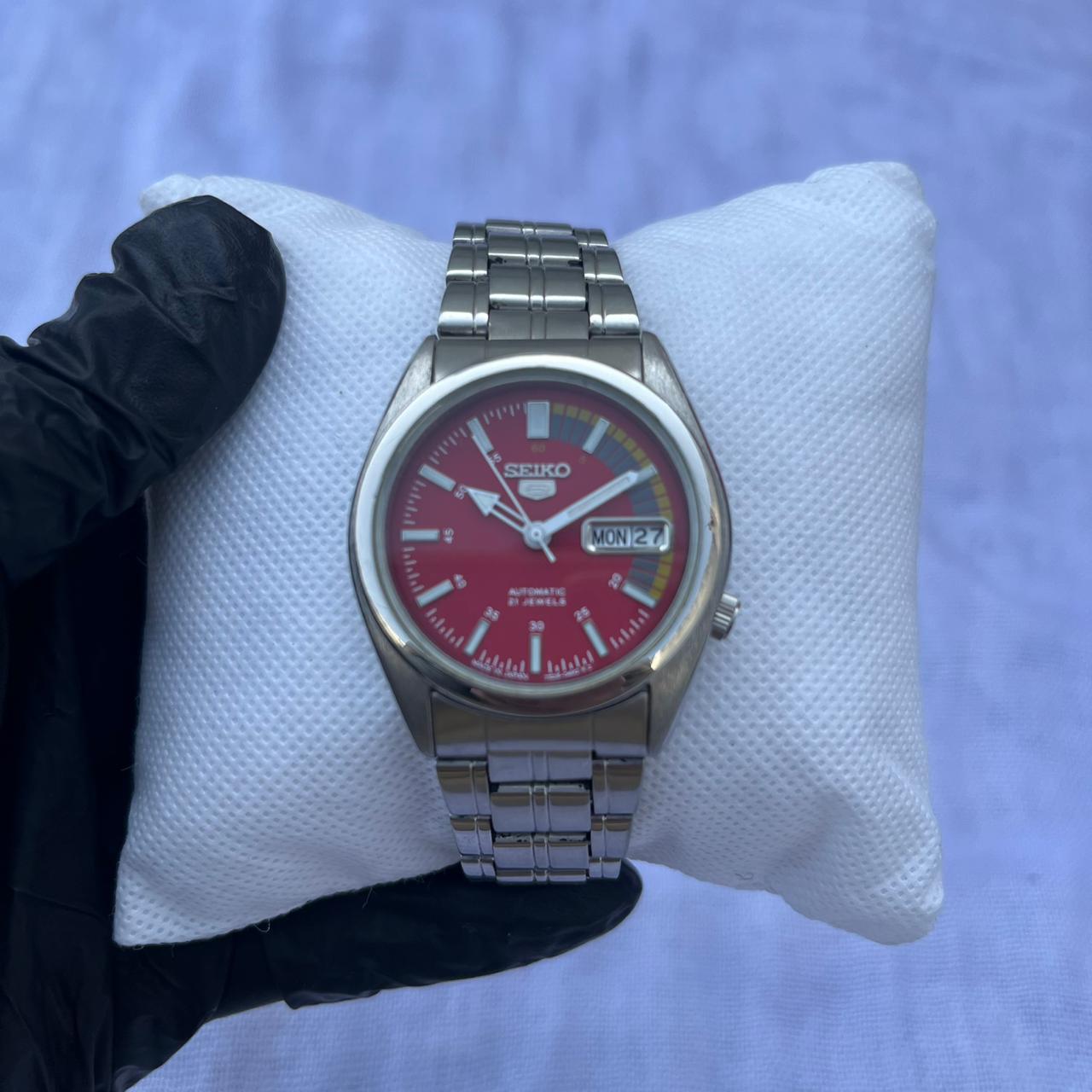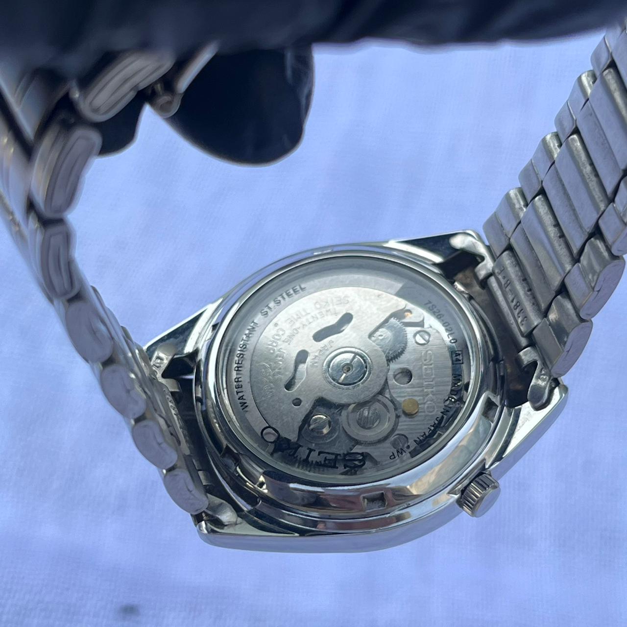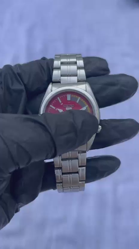 This is a unique and bold Seiko 5 Automatic men's watch, featuring a rare hexagonal stainless steel case that embodies the experimental design era of the 1970s. The dark dial is framed by a striking black and gold "Coke" style inner track, creating a high-contrast, sporty aesthetic that is a standout for any vintage Seiko collector.