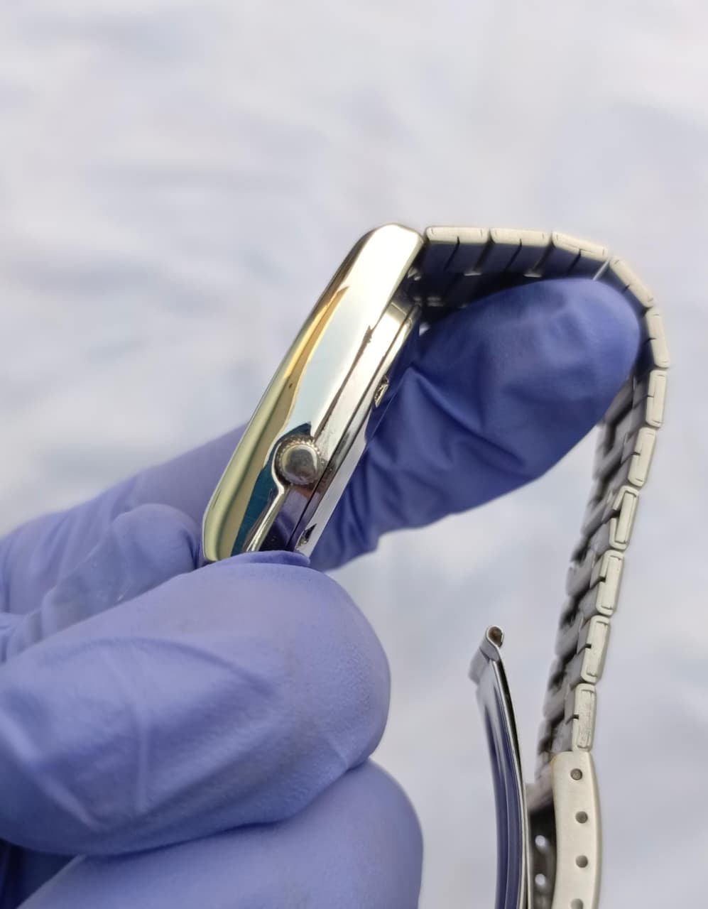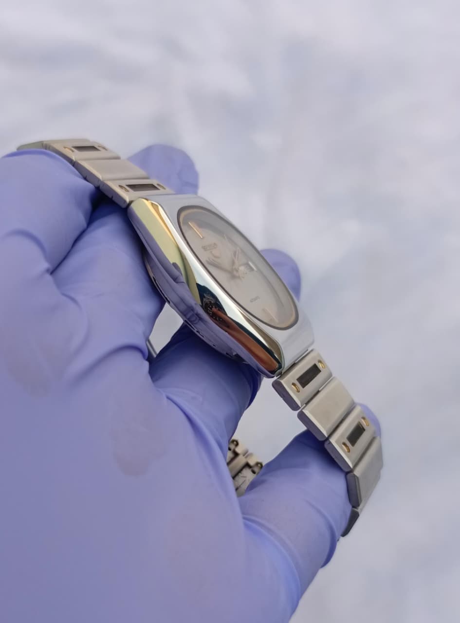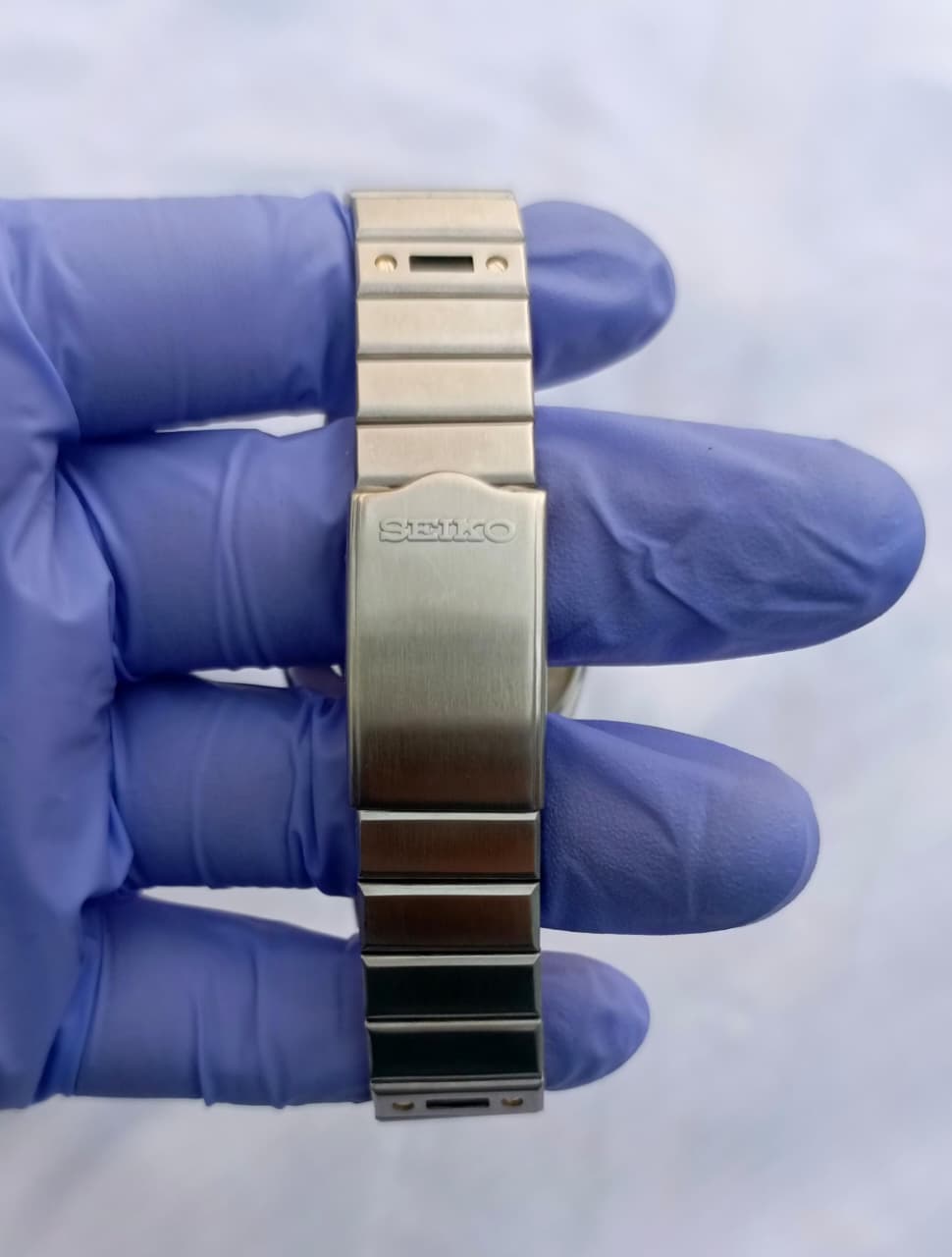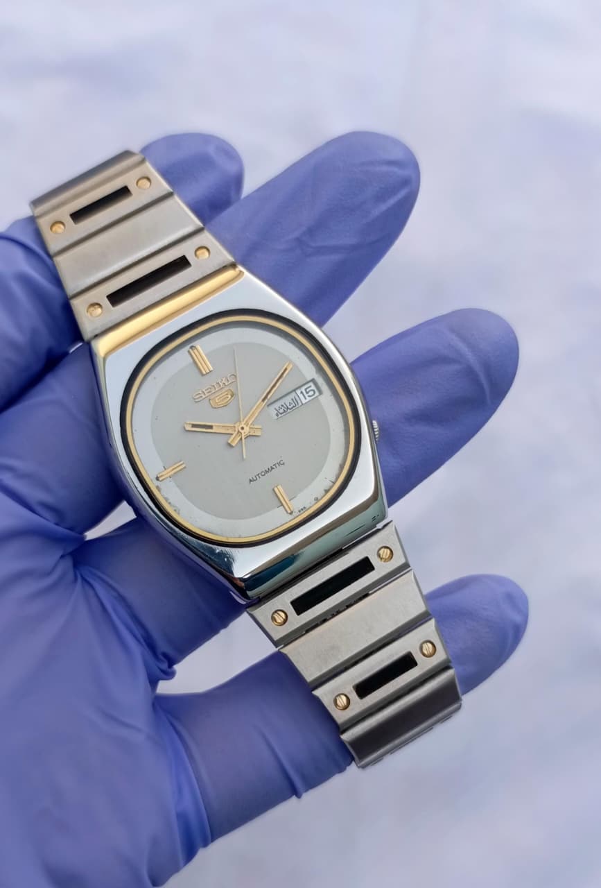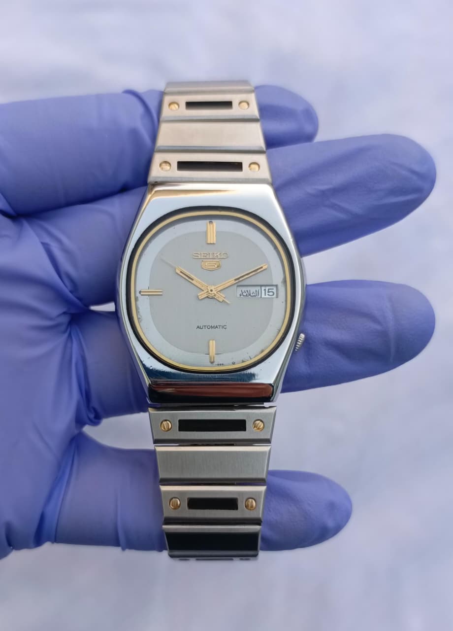 This is a vintage Seiko 5 Automatic men's watch, likely from the 1970s, featuring a distinctive cushion-shaped stainless steel case and an integrated bracelet style. The watch has a clean silver/off-white dial with applied baton indices and a day/date window displaying the day in both English and Arabic script, making it a classic retro timepiece.