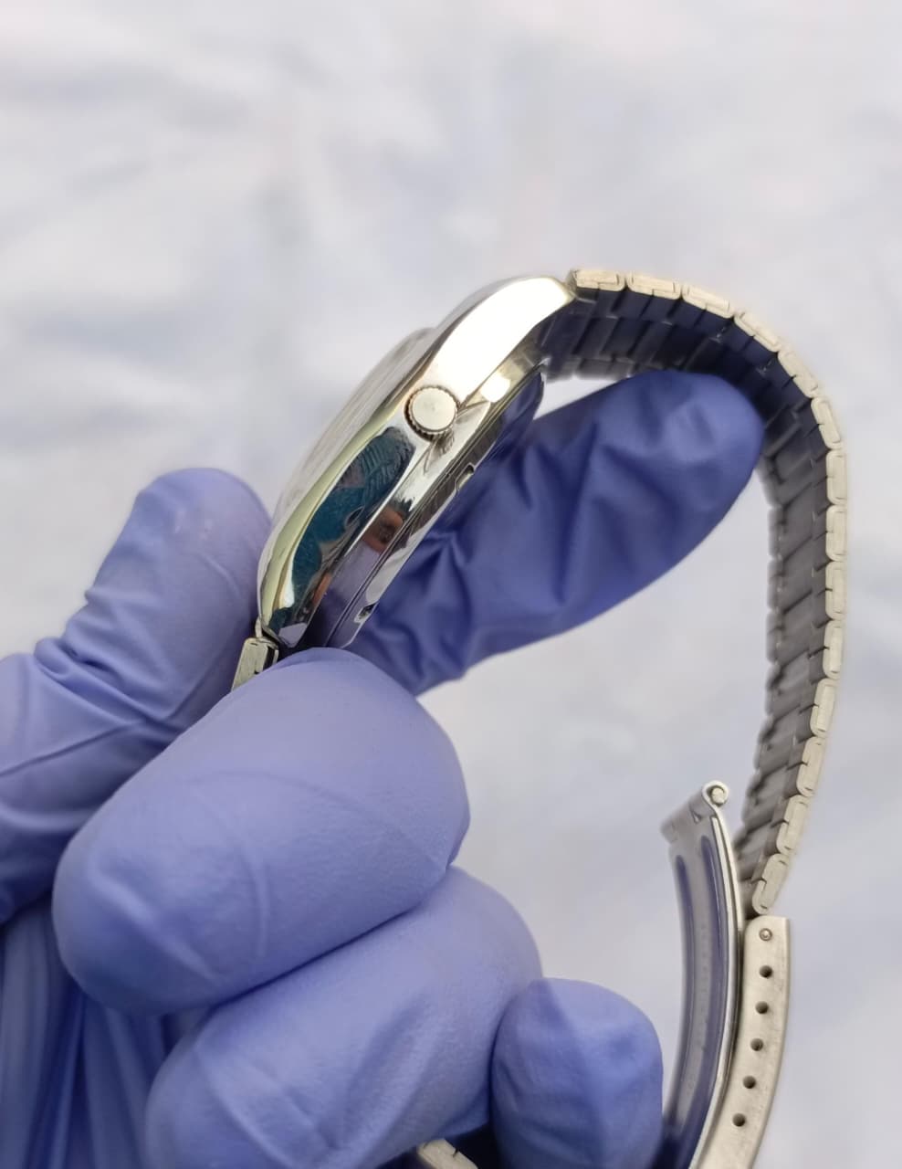 This is a distinctive and highly sought-after Seiko 5 Automatic 21 Jewels men's watch, notable for its striking square case design characteristic of the 1970s era. It features a contrasting white, textured round dial set within the black border of the square case, along with a day/date window and golden hands, making it a unique statement piece.