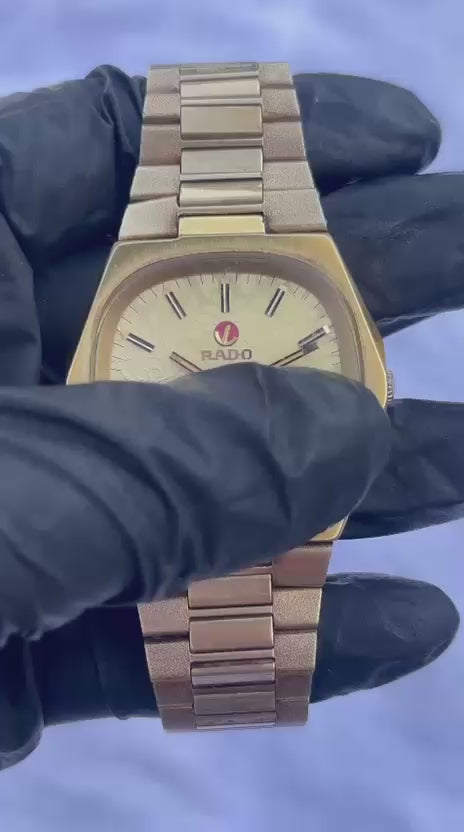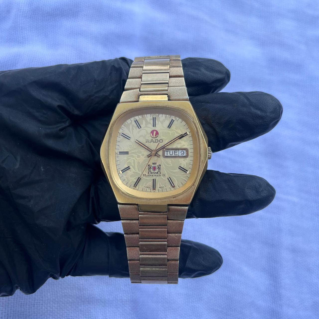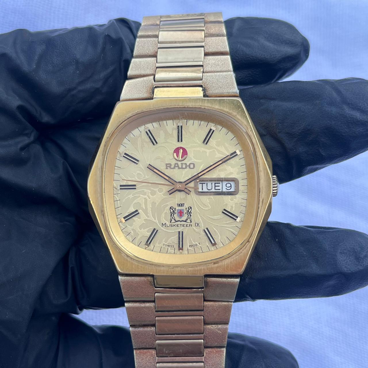 This is a rare and exceptionally artistic Rado Musketeer IX, a timepiece that stands out for its unique blend of 1970s geometric case design and ornate dial work. The centerpiece is its champagne gold dial, which features an intricate embossed floral or "brocade" pattern, making it a true statement piece for collectors of avant-garde Swiss watches.