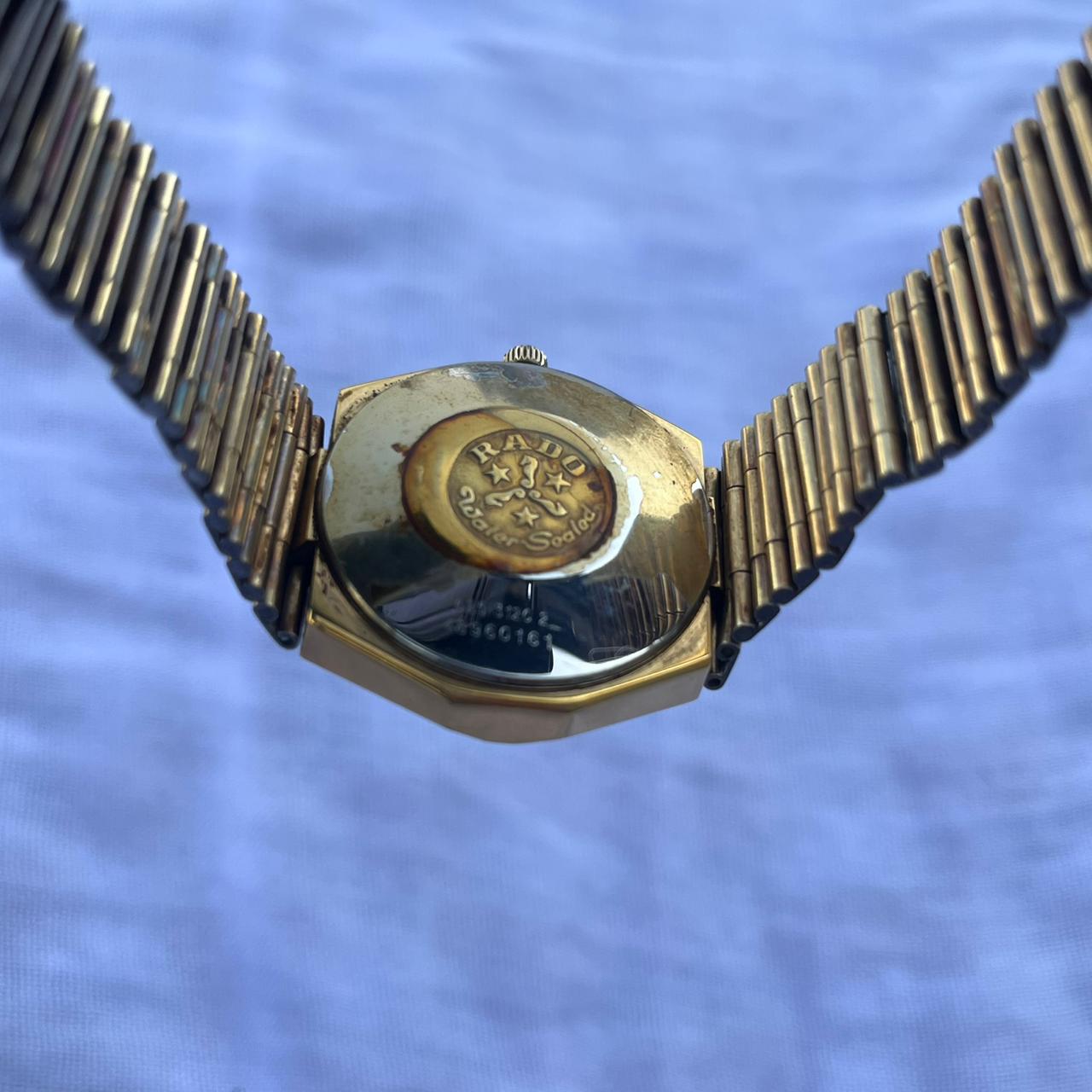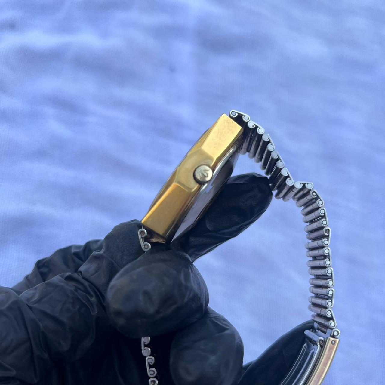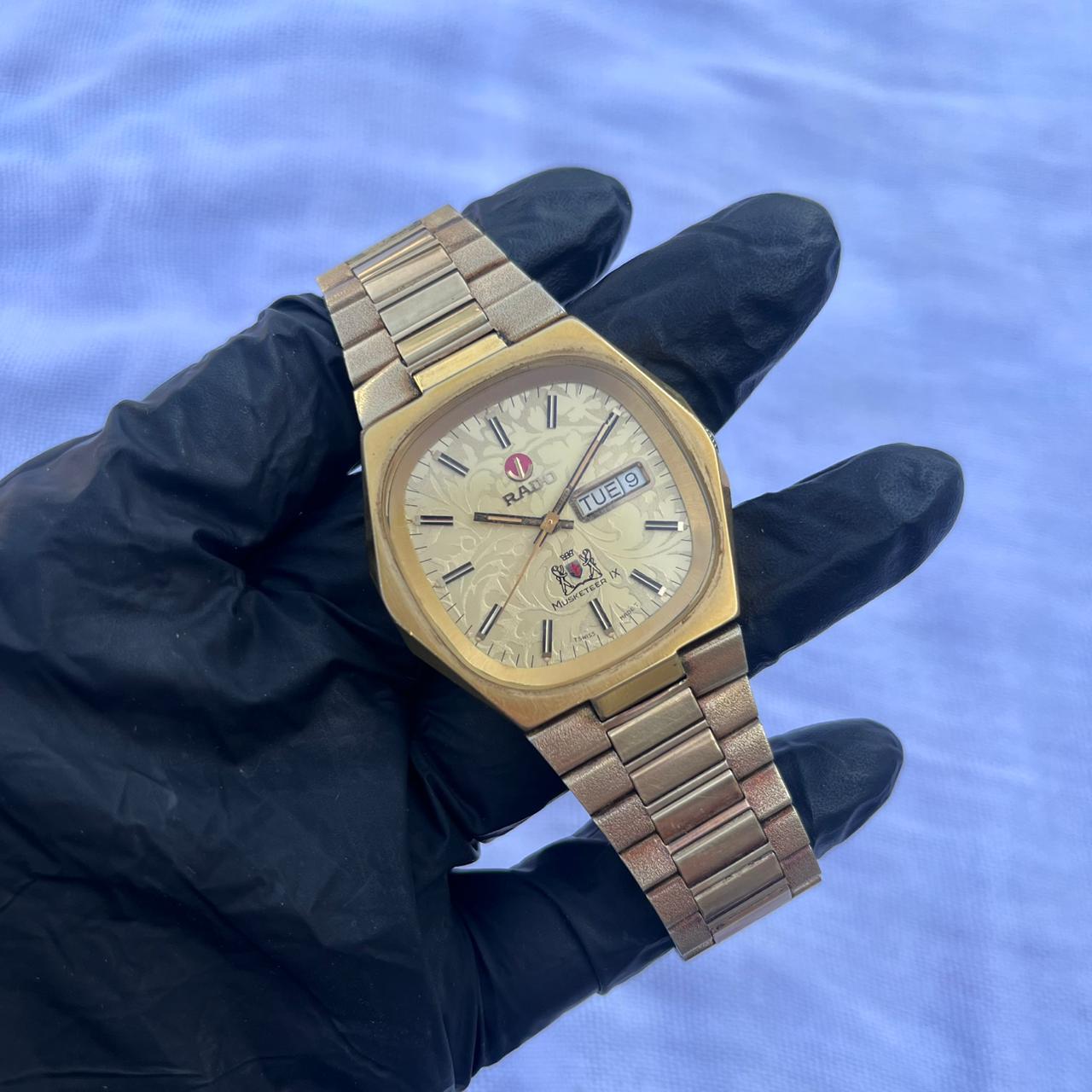 This is a rare and exceptionally artistic Rado Musketeer IX, a timepiece that stands out for its unique blend of 1970s geometric case design and ornate dial work. The centerpiece is its champagne gold dial, which features an intricate embossed floral or "brocade" pattern, making it a true statement piece for collectors of avant-garde Swiss watches.