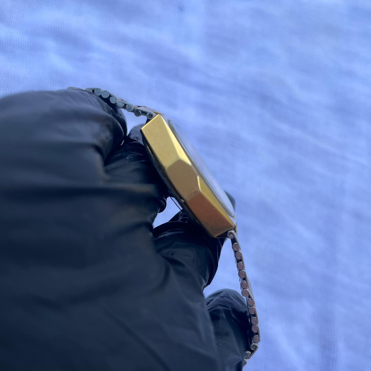 Case Design: Angular, Tonneau-style Brushed Gold-tone case