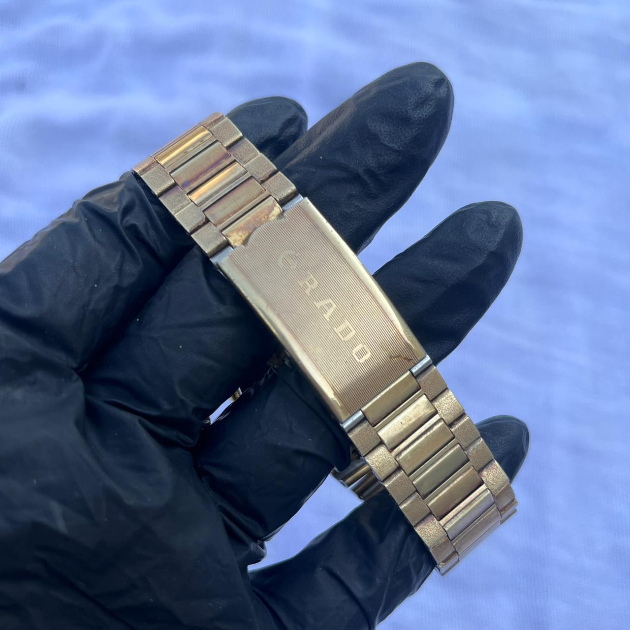 Dial Details: Features the iconic Rado rotating anchor logo at the 12 o'clock position and the Musketeer crest at the 6 o'clock position