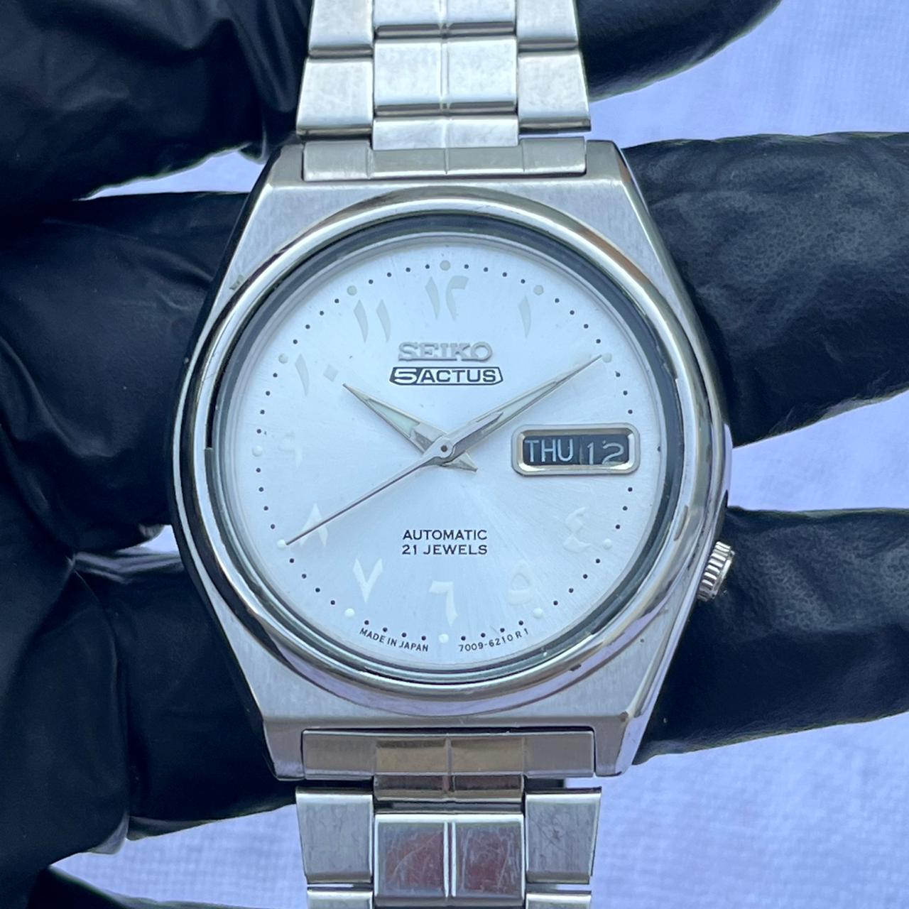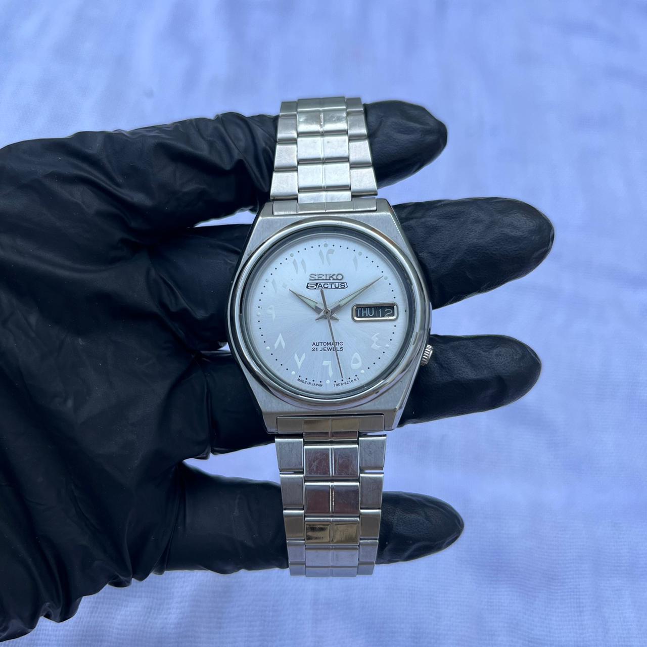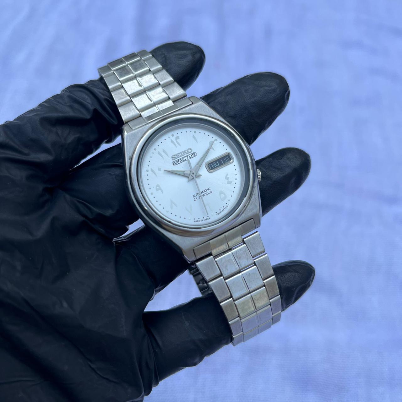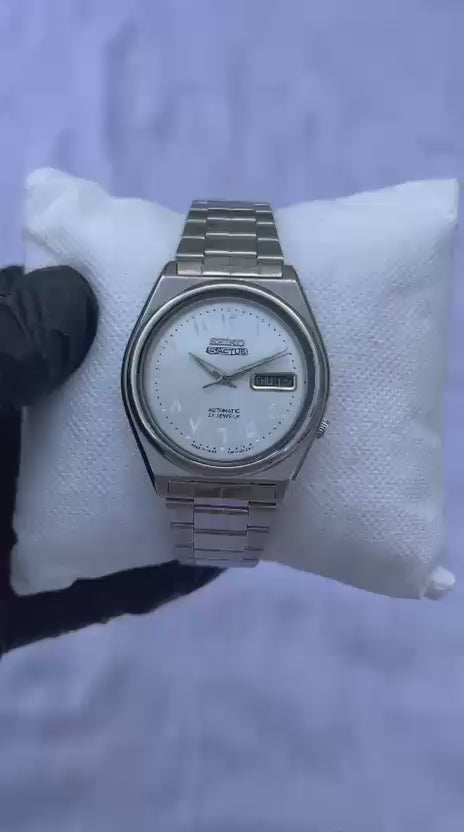 This is a rare and elegant Seiko 5 Actus men's watch, a vintage model highly regarded for its distinctive styling and Japanese craftsmanship. It features a clean white sunburst dial adorned with Full Eastern Arabic Numerals, offering a unique cultural aesthetic that is particularly popular among collectors of "Middle East" market timepieces.