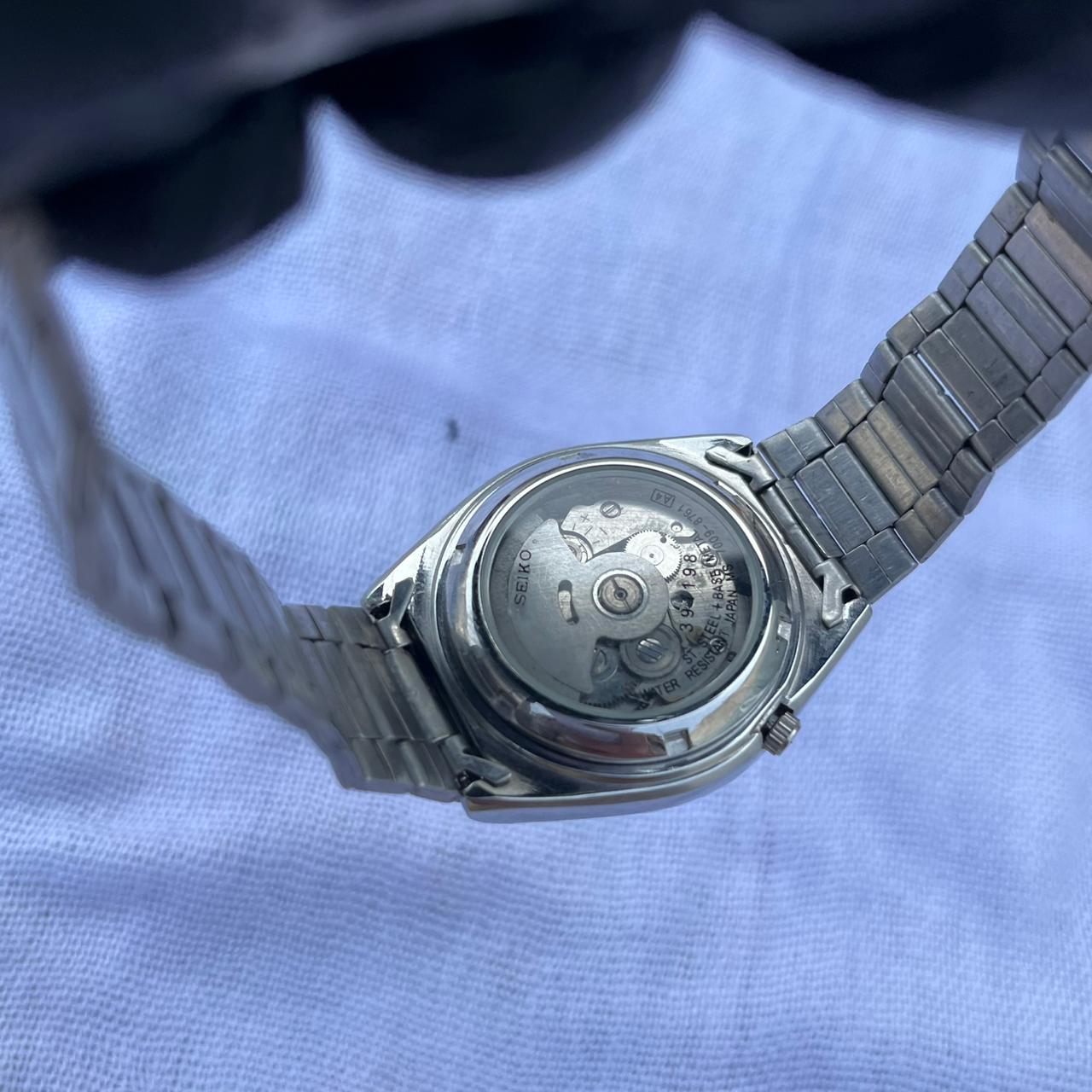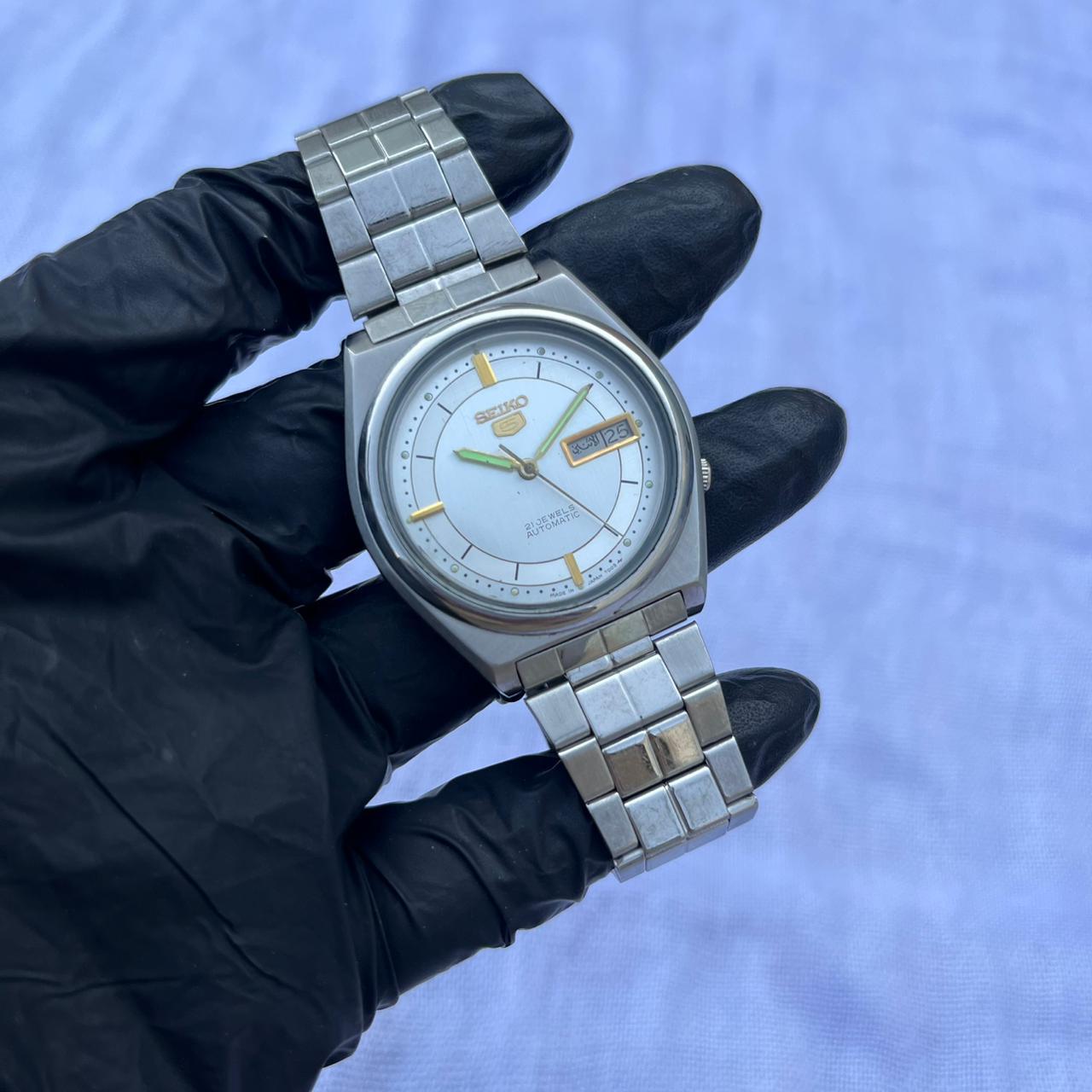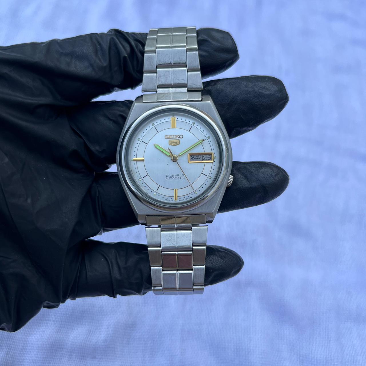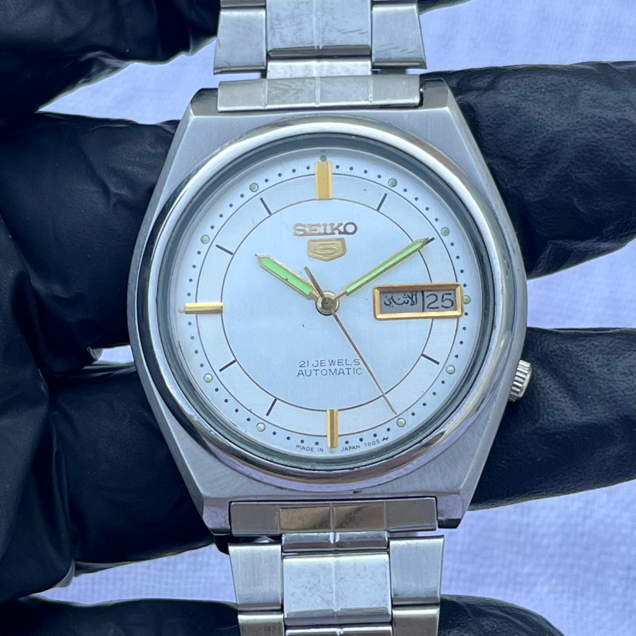 This is a clean and sophisticated Seiko 5 Automatic men's watch, featuring a refined aesthetic that balances minimalist design with intricate detailing. It boasts a white dial with a distinctive "rail-track" minute scale. Accented by gold-tone markers and luminous hands, this timepiece offers a versatile retro look that is perfect for any vintage watch enthusiast.