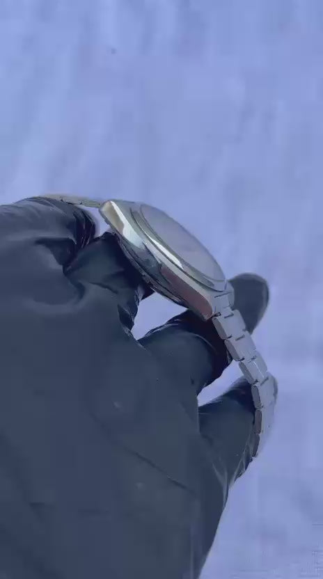Day/Date Window: Gold-framed Day and Date display at the 3 o'clock position, featuring an Arabic script option