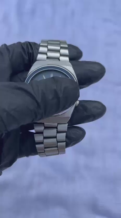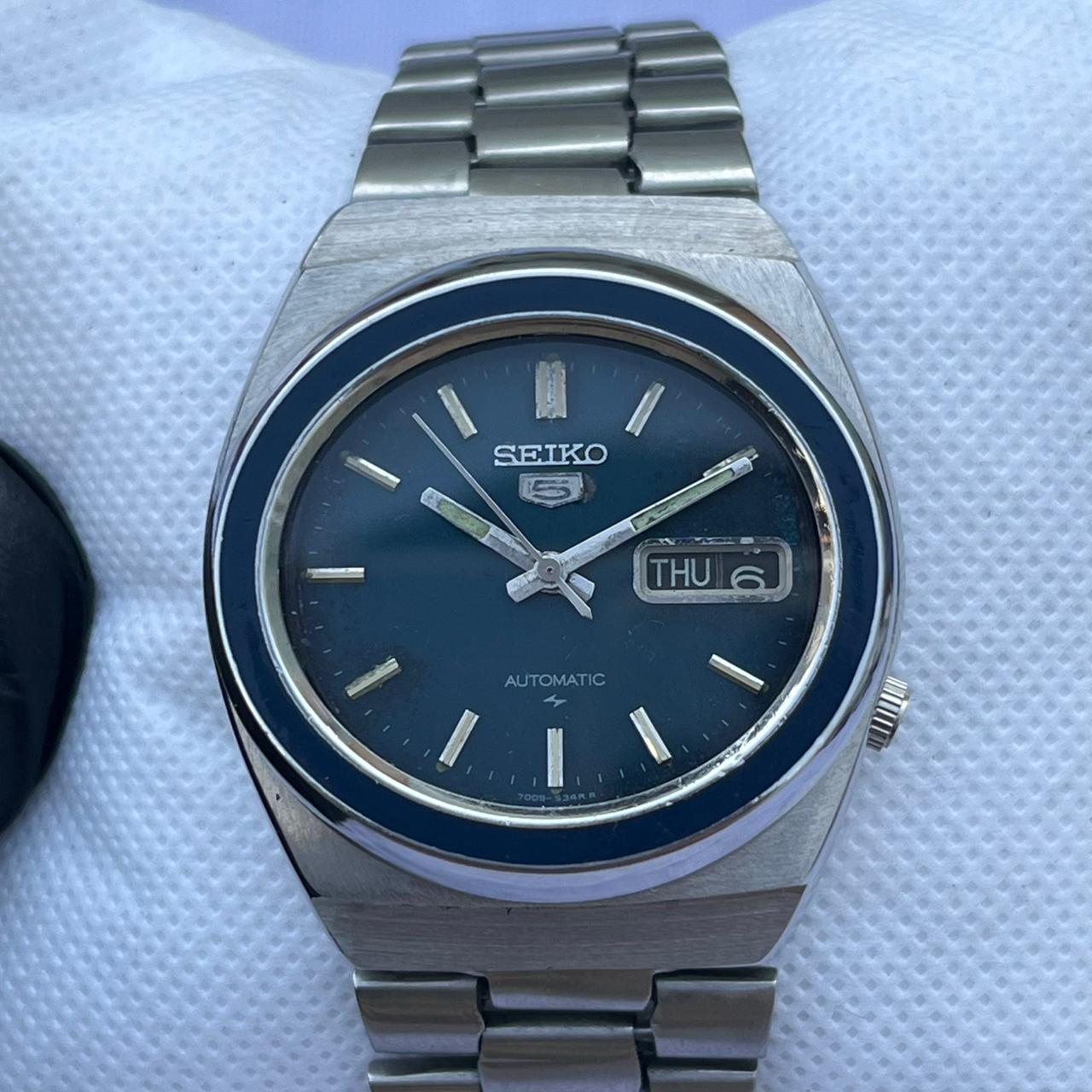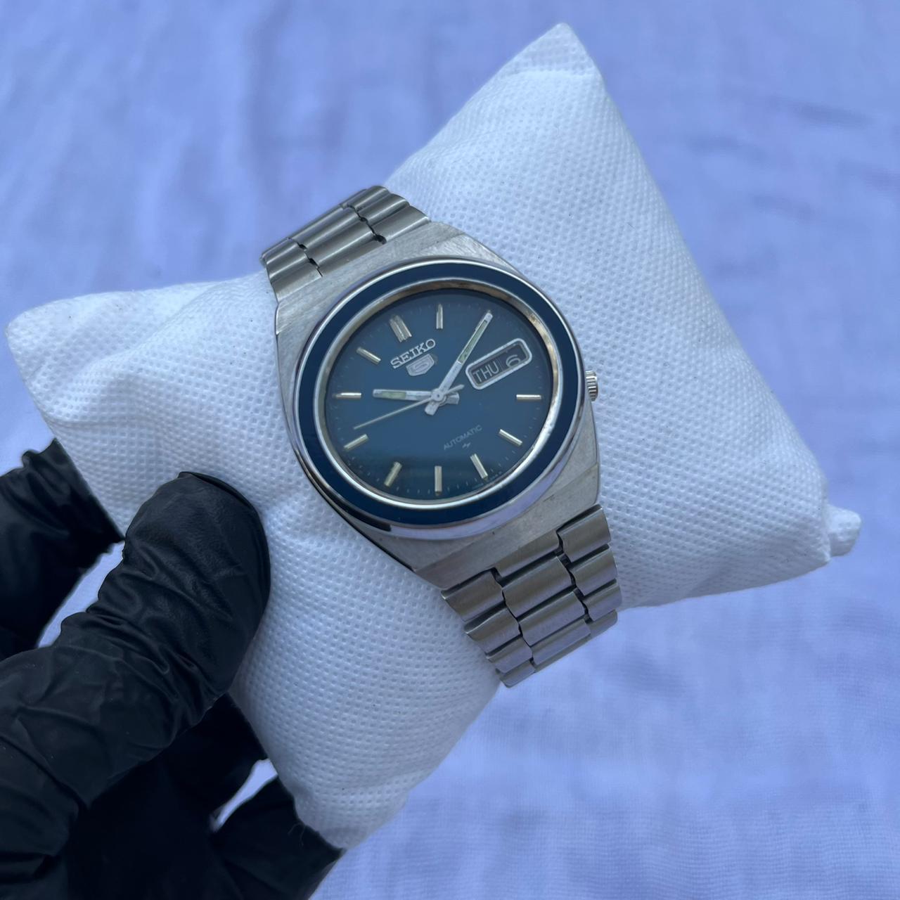 This is a classic and versatile Seiko 5 Automatic men's watch, a vintage staple known for its reliability and clean, timeless aesthetic. It features a deep royal blue sunburst dial that catches the light beautifully, housed in a polished stainless steel case and paired with a comfortable jubilee-style bracelet. Its minimalist design makes it an ideal choice for both professional settings and casual daily wear.