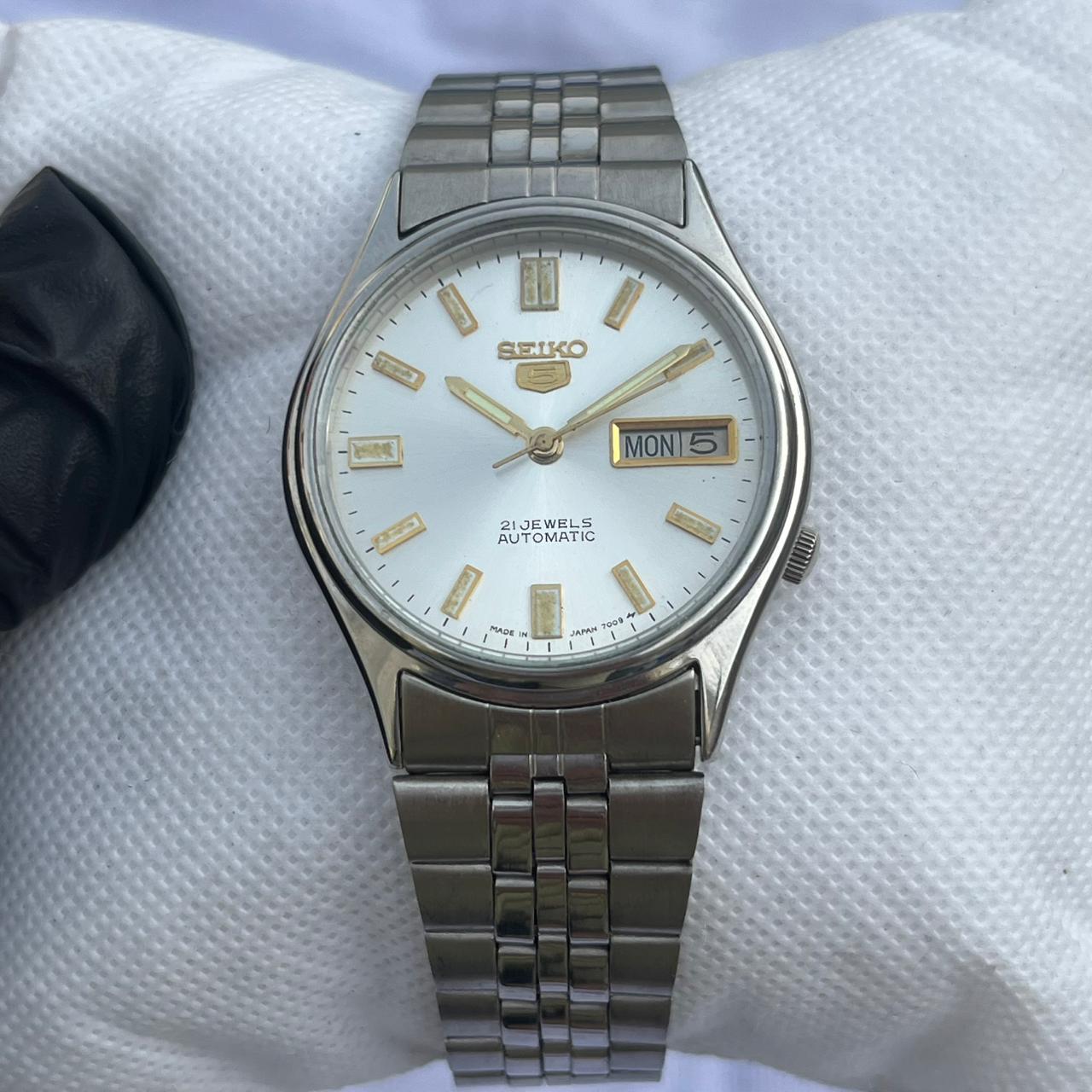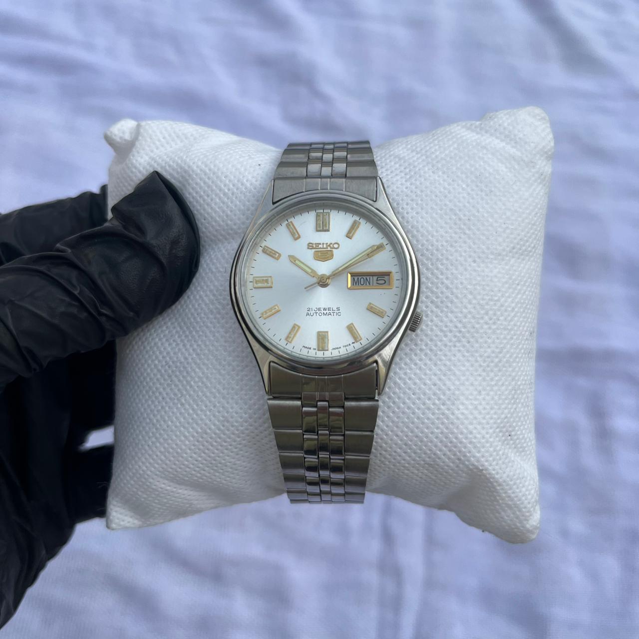 Classic Seiko 5 White & Gold Men's Watch | 21 Jewels Automatic | Stainless Steel Jubilee Band