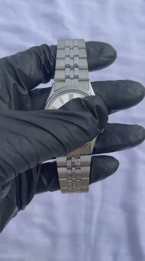 This elegant Seiko 5 Automatic is a classic example of timeless Japanese watchmaking. It features a brilliant sunburst white dial complemented by luxurious gold-tone accents and a versatile stainless steel jubilee-style bracelet. Perfectly balanced for both formal and casual wear, this 21-jewel timepiece is a staple for any vintage collection.
