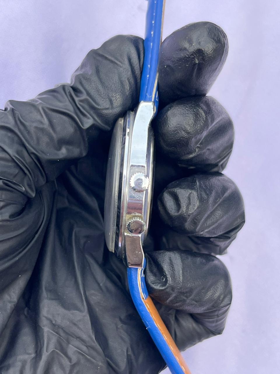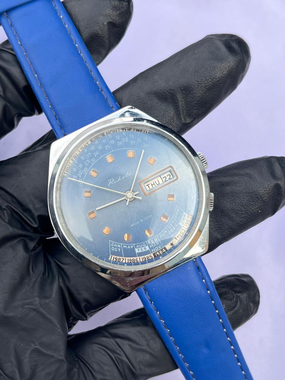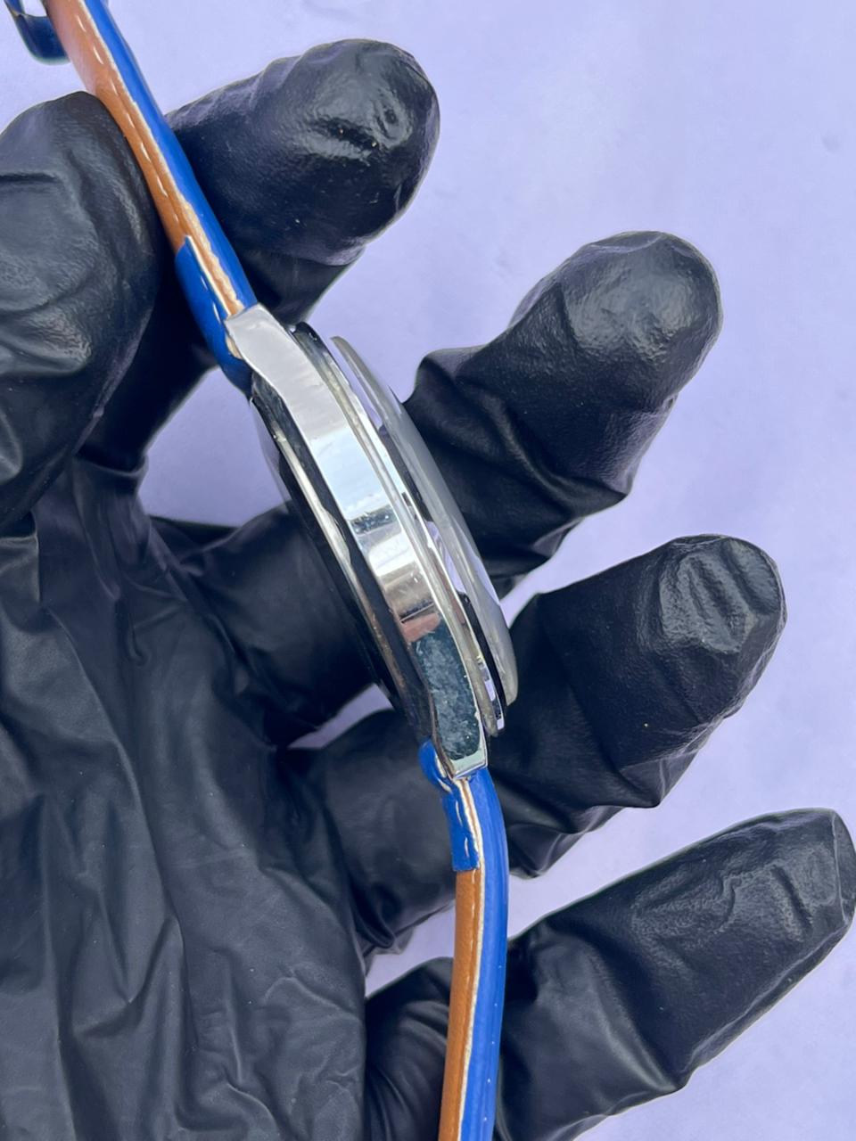Band Material: Vibrant blue leather strap with matching stitching.