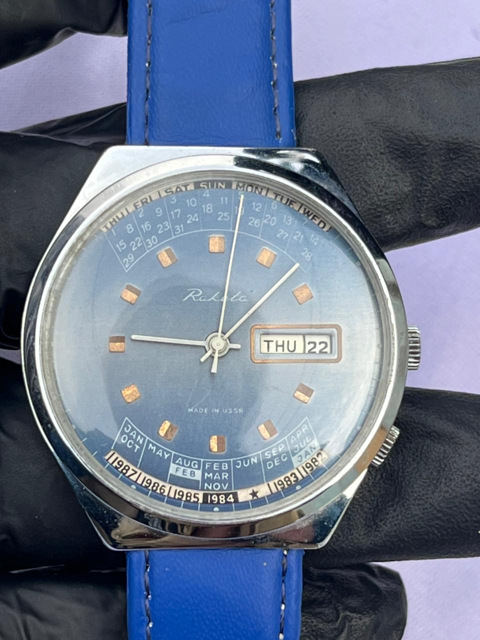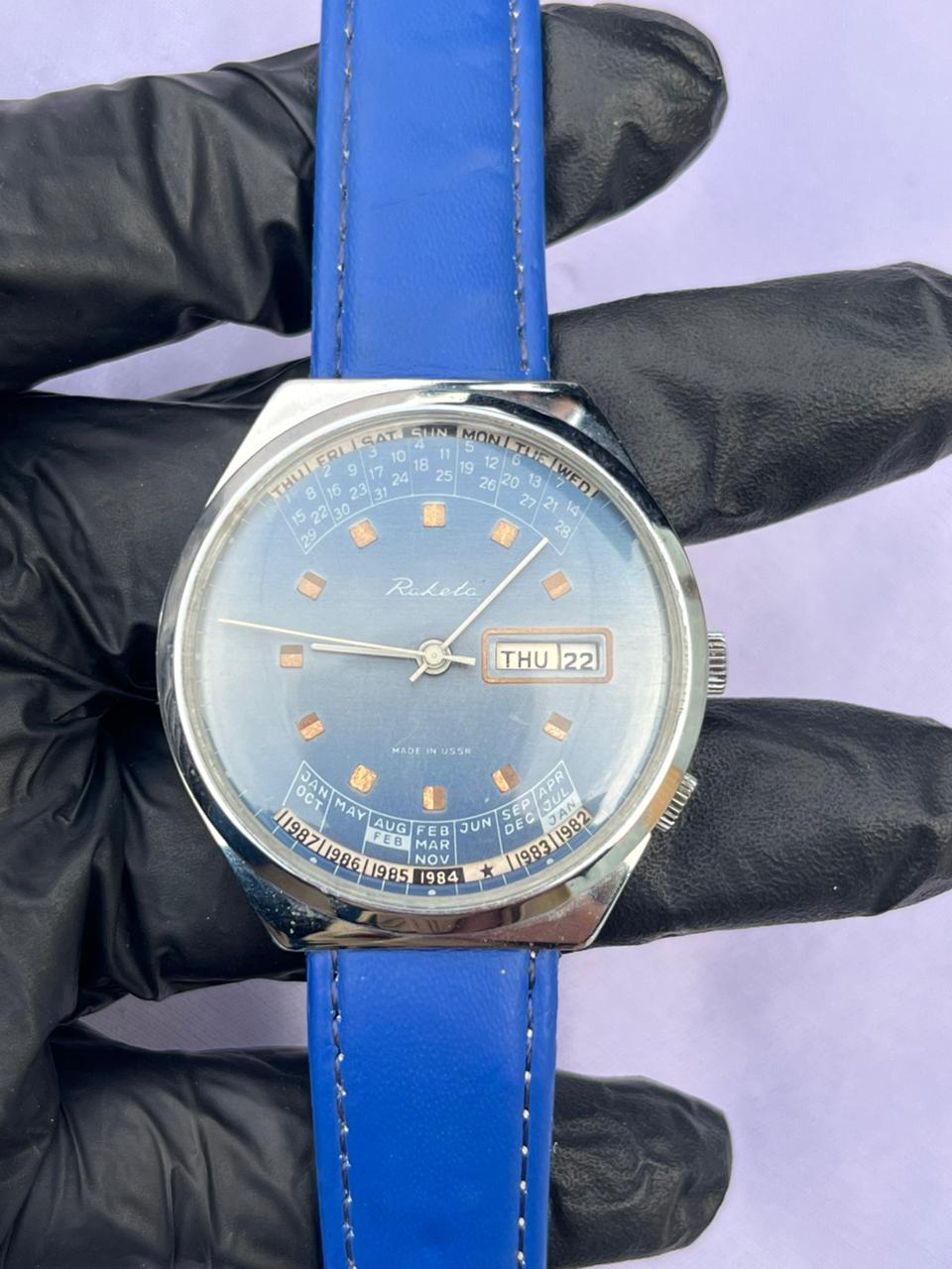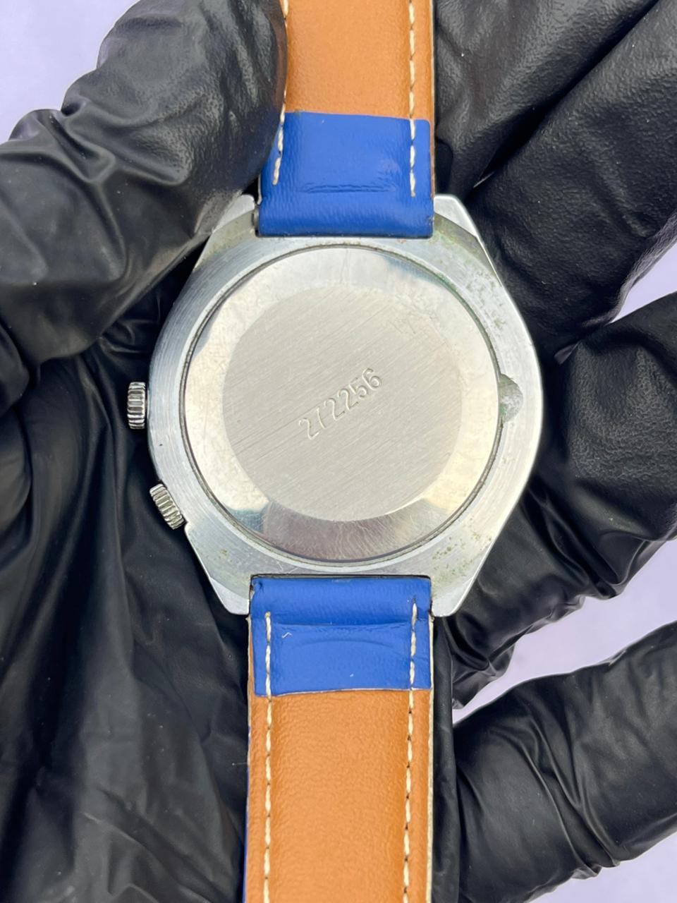 Band Material: Vibrant blue leather strap with matching stitching.