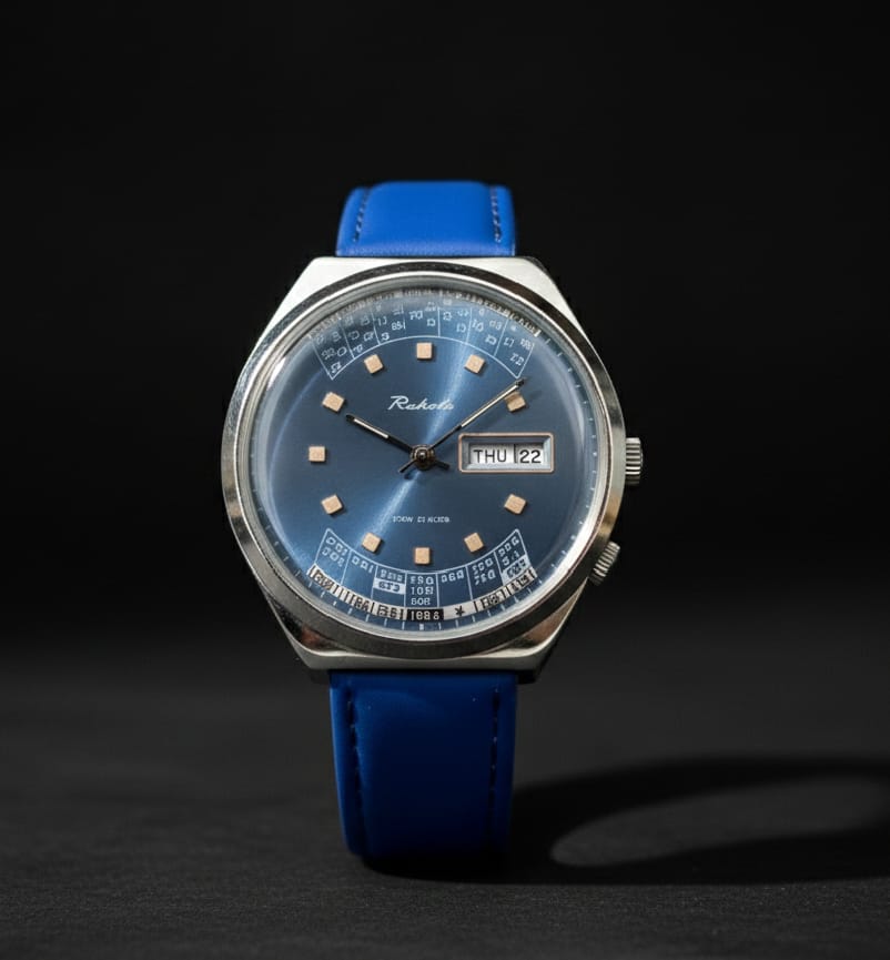 Dial Color: Deep Sunburst Blue with gold-tone square indices.