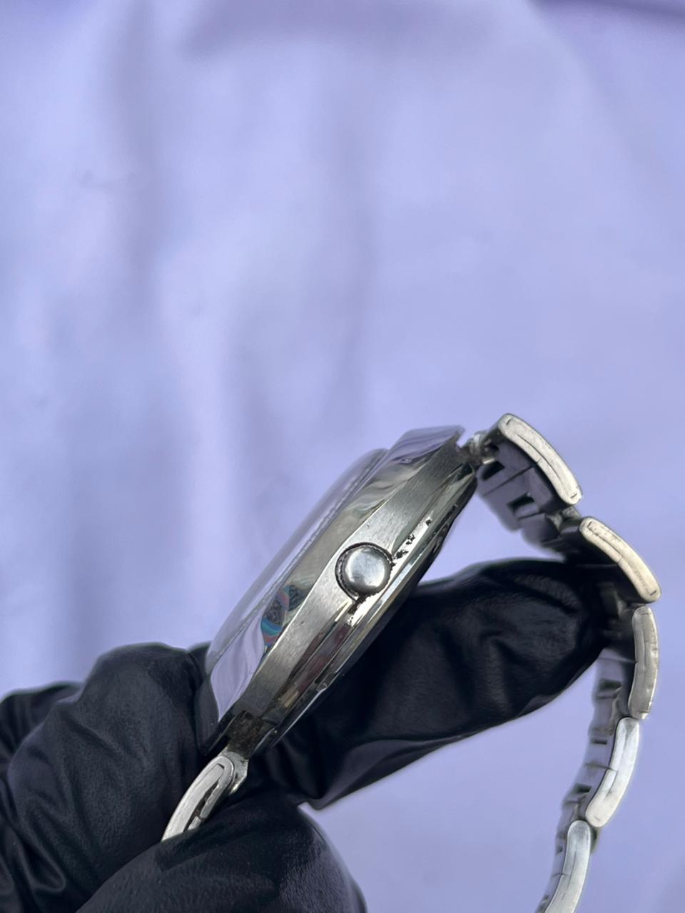 Day/Date Window: Distinctive vertical display at the 6 o'clock position.