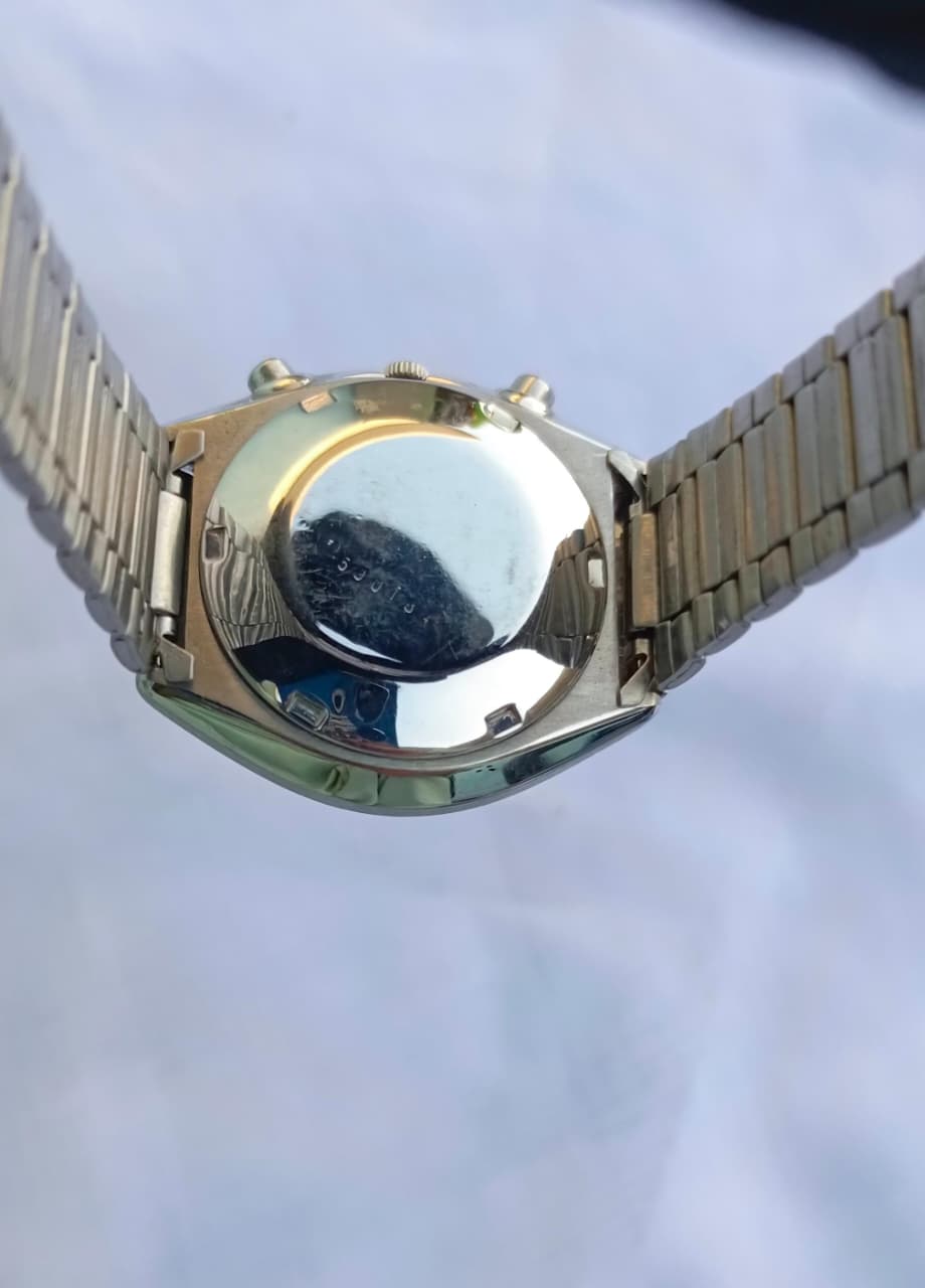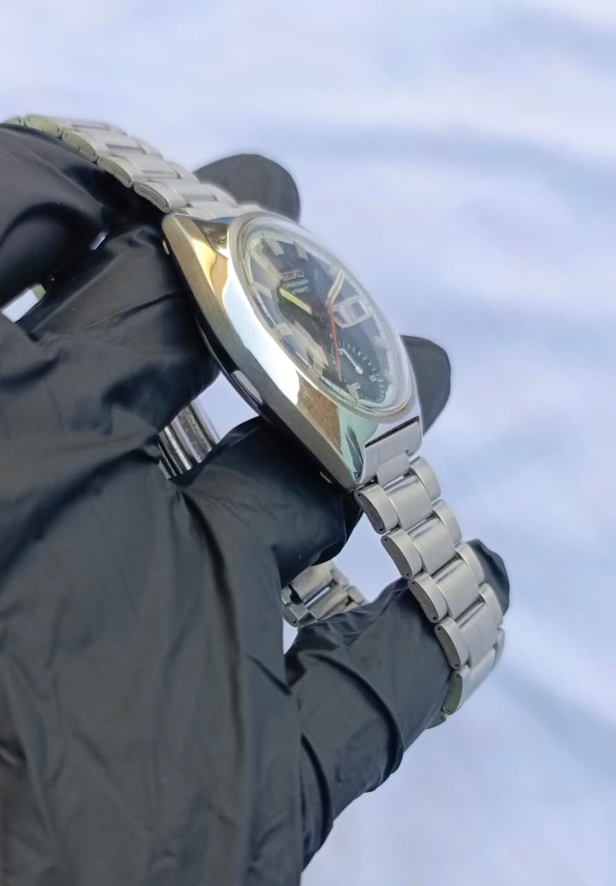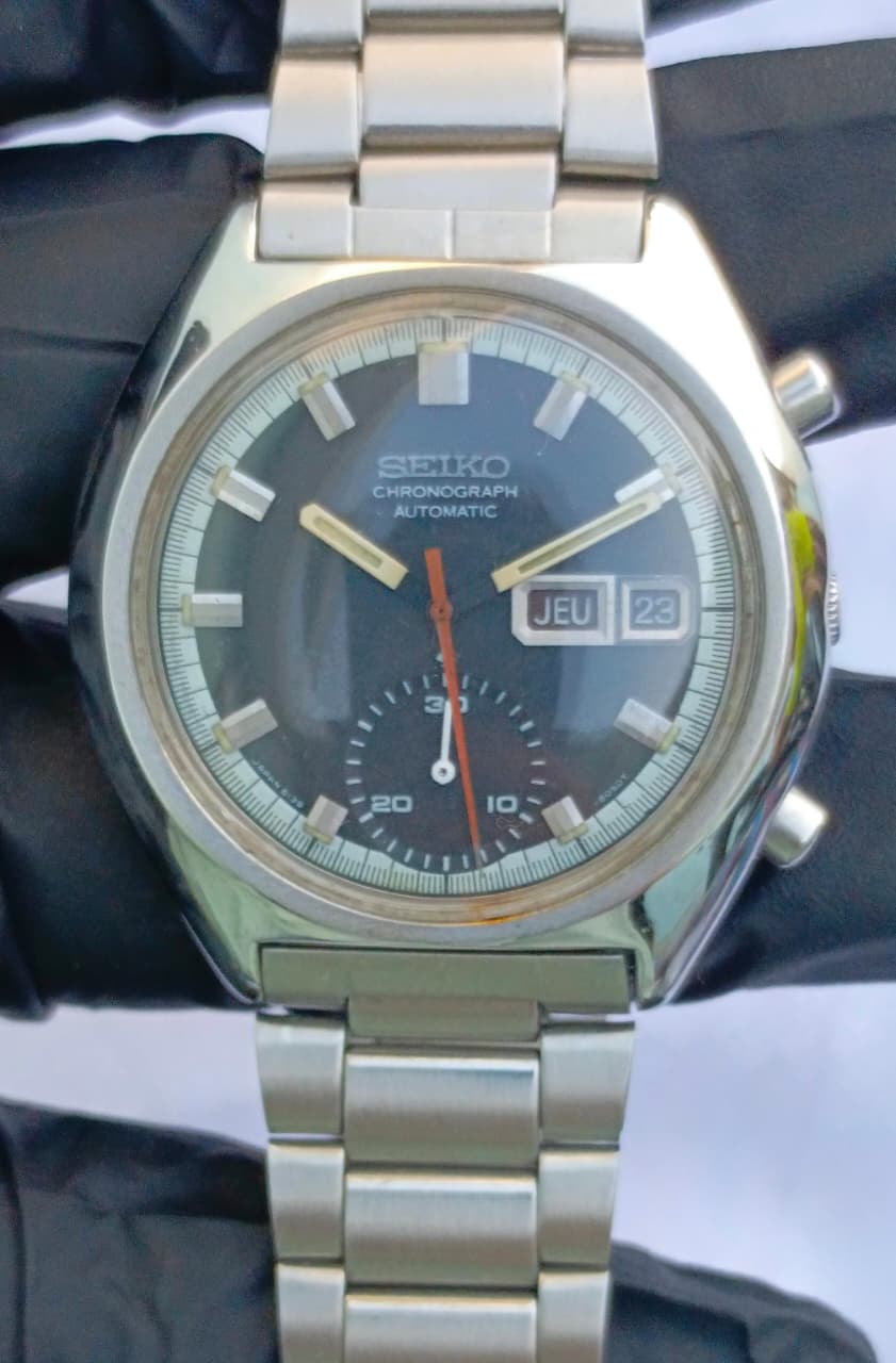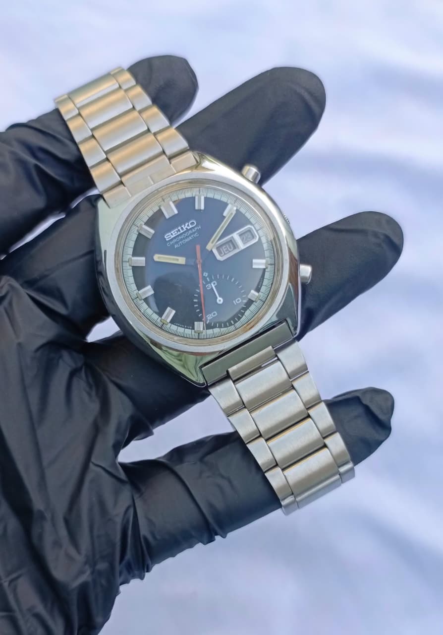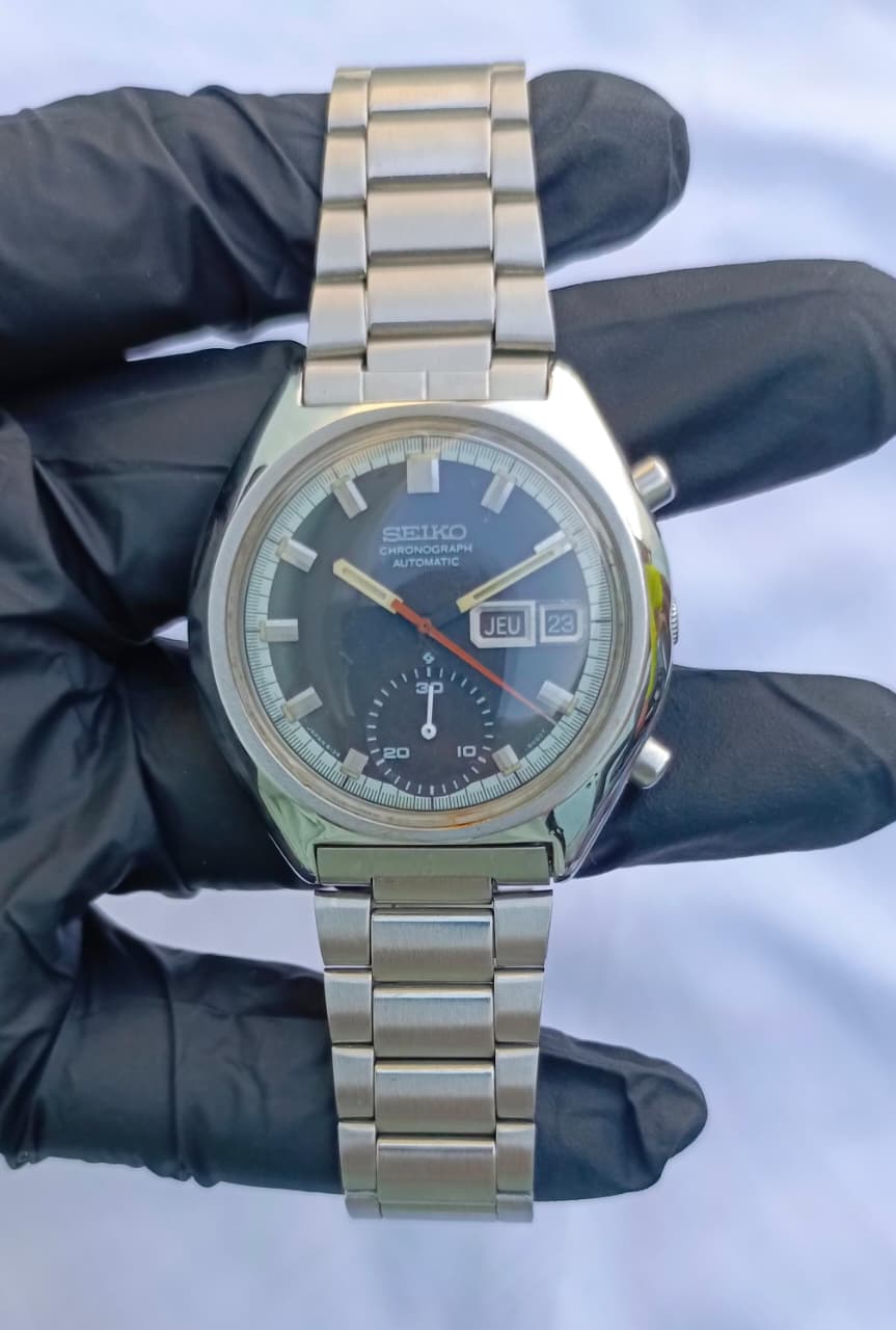 This is a distinctive and highly collectible vintage Seiko Automatic Chronograph, a true icon of 1970s watch design. This model features a robust stainless steel case with the classic tonneau/cushion shape and chronograph pushers. The watch houses a reliable automatic movement, and the dark blue/black dial is complemented by a contrasting sub-dial, a red/orange sweeping hand, and a day/date window displaying the day in a dual language (likely English/French or similar, shown as "JEU" for Jeudi/Thursday). It retains its original vintage aesthetic with a matching stainless steel integrated bracelet. A must-have for any serious vintage watch collector.