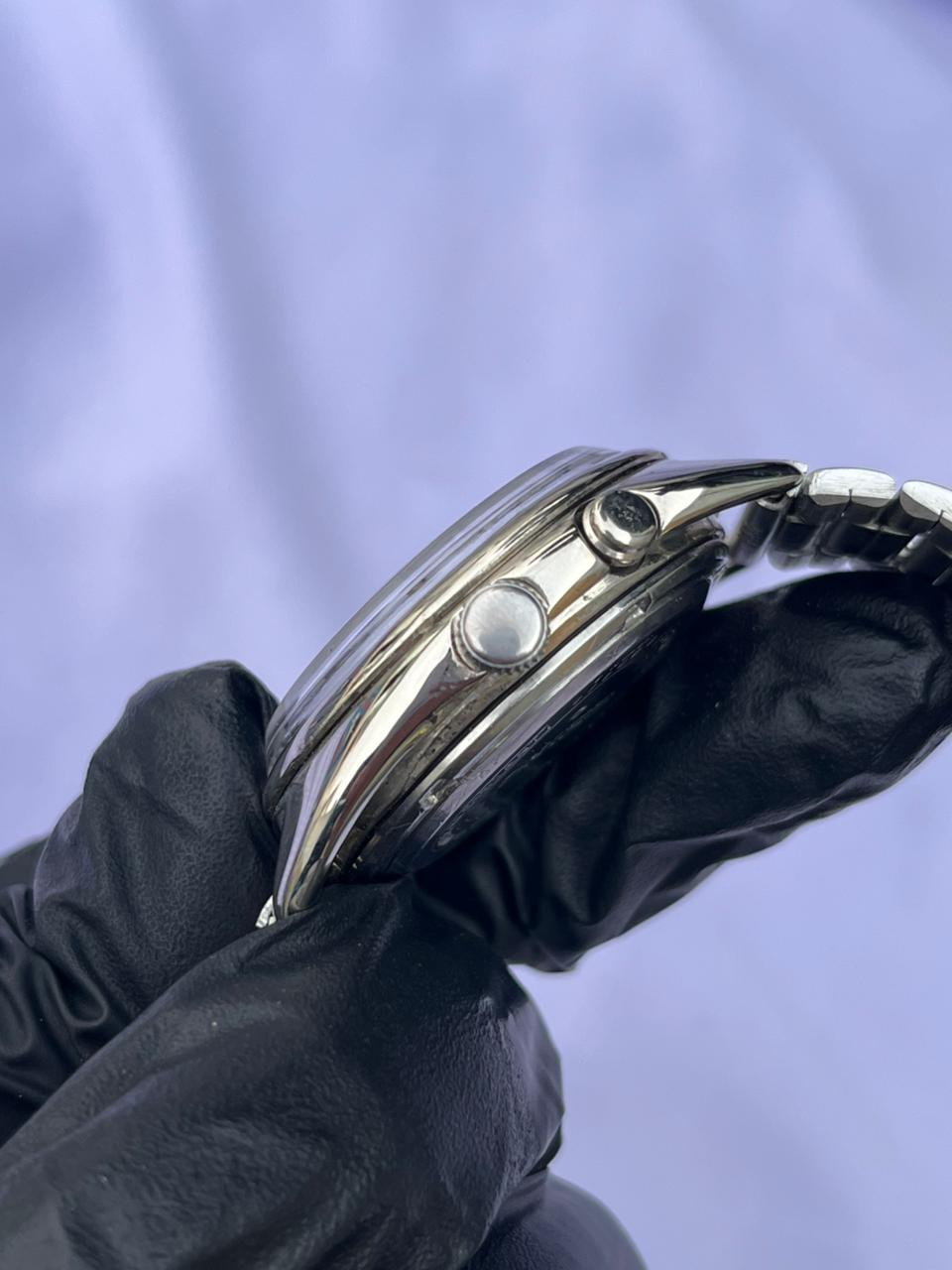 Day/Date Window: Dual display at 3 o'clock showing day (English) and date.