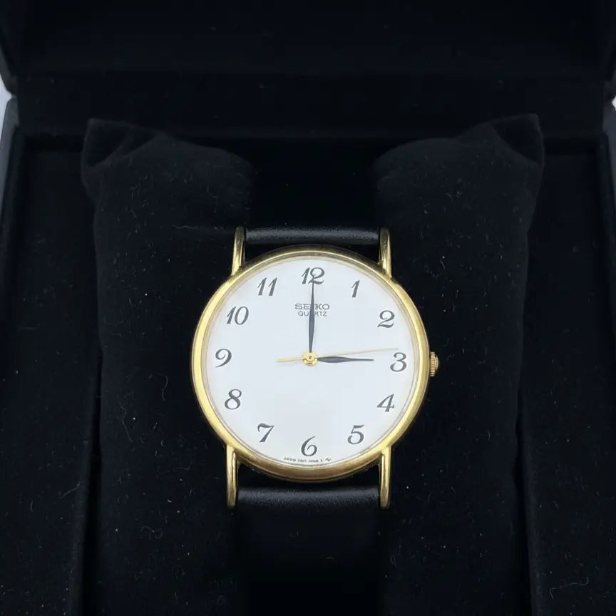 Hands: Slim black hour and minute hands with a gold-tone seconds hand.