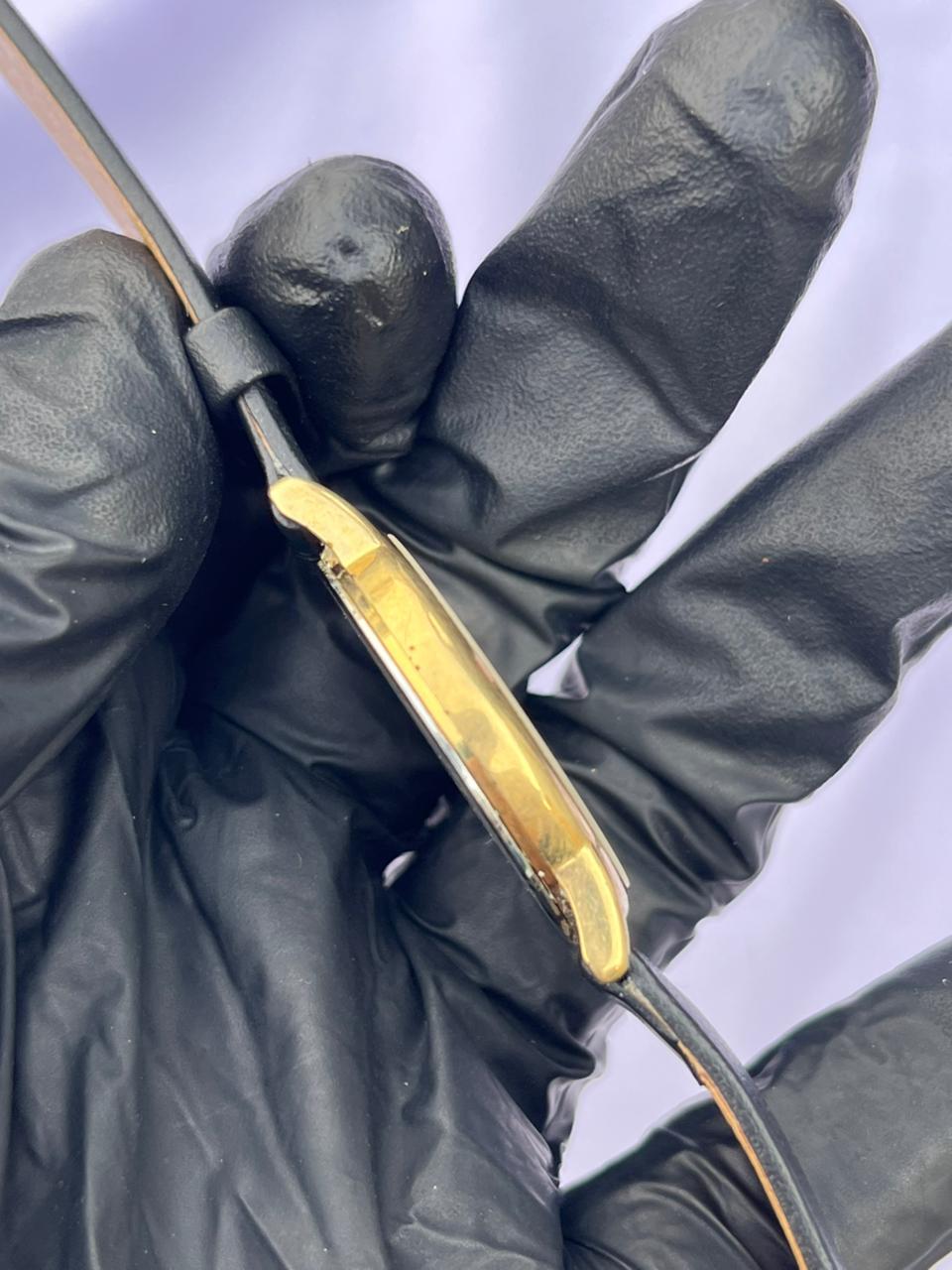 Case Material: Gold-tone round case with unique extended "T-bar" lugs.