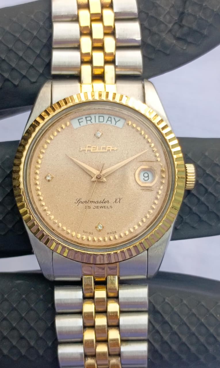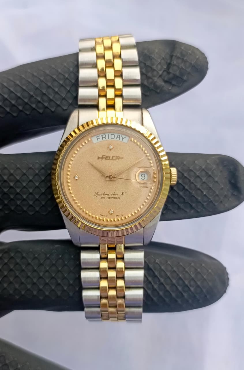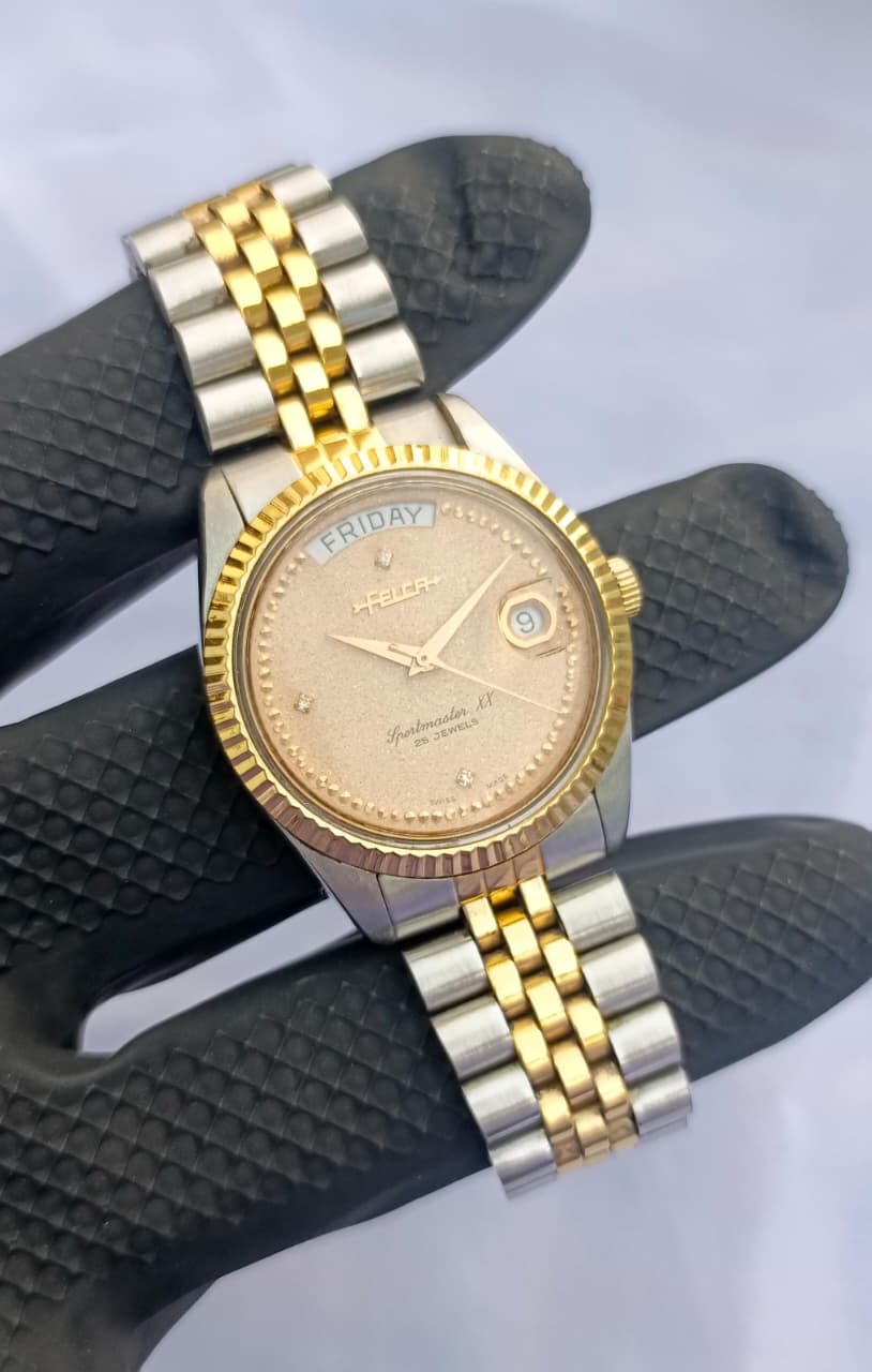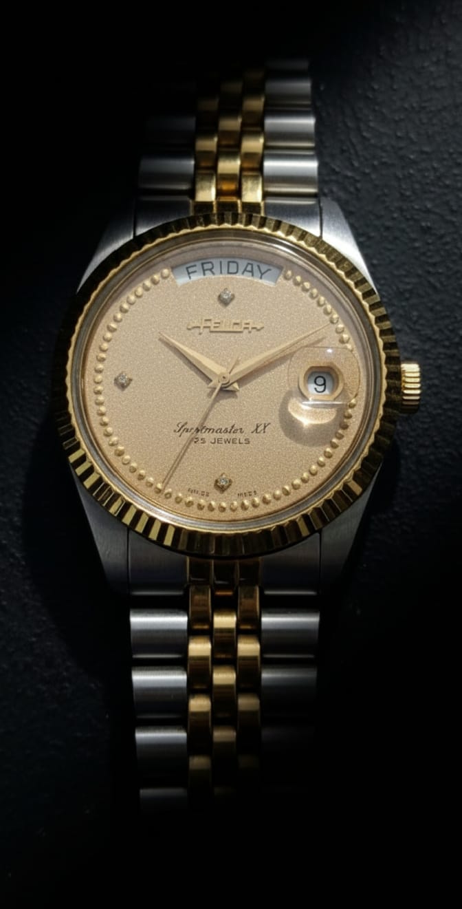 A sophisticated blend of vintage charm and Swiss precision, the Felca Sportmaster XX stands out with its shimmering champagne-gold dial and refined two-tone Jubilee bracelet. Enhanced with diamond-accent hour markers and a fluted bezel, this automatic timepiece delivers both elegance and reliability for everyday or formal wear.
