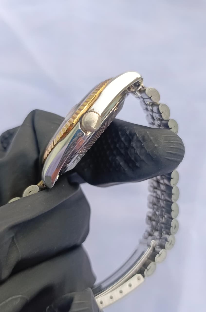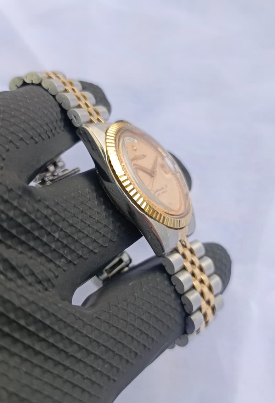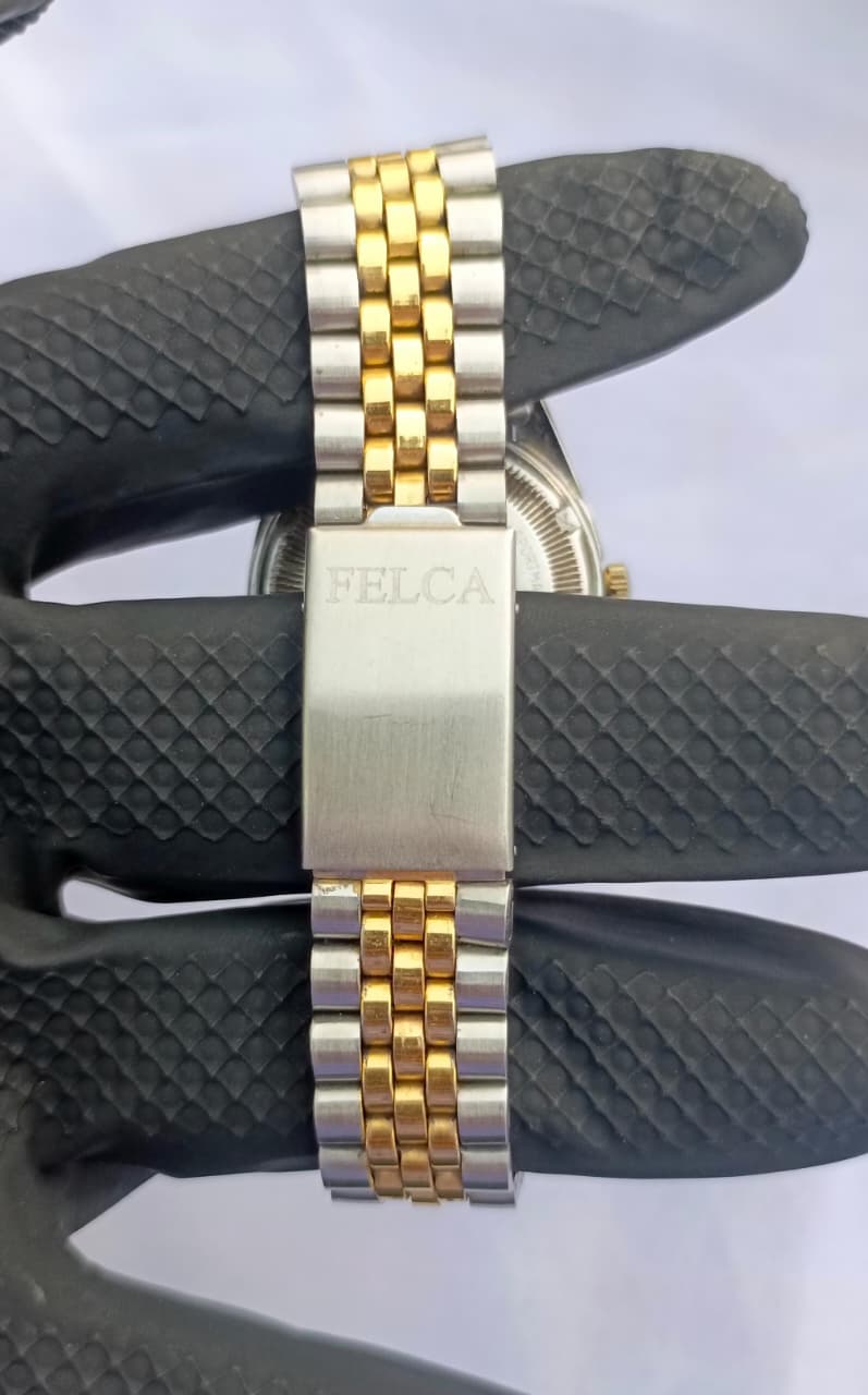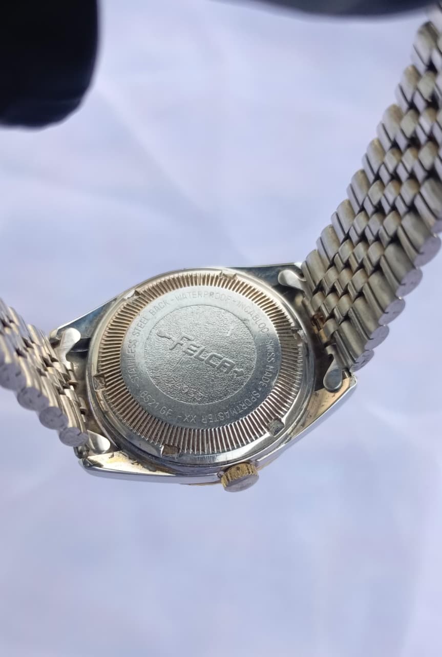 A sophisticated blend of vintage charm and Swiss precision, the Felca Sportmaster XX stands out with its shimmering champagne-gold dial and refined two-tone Jubilee bracelet. Enhanced with diamond-accent hour markers and a fluted bezel, this automatic timepiece delivers both elegance and reliability for everyday or formal wear.