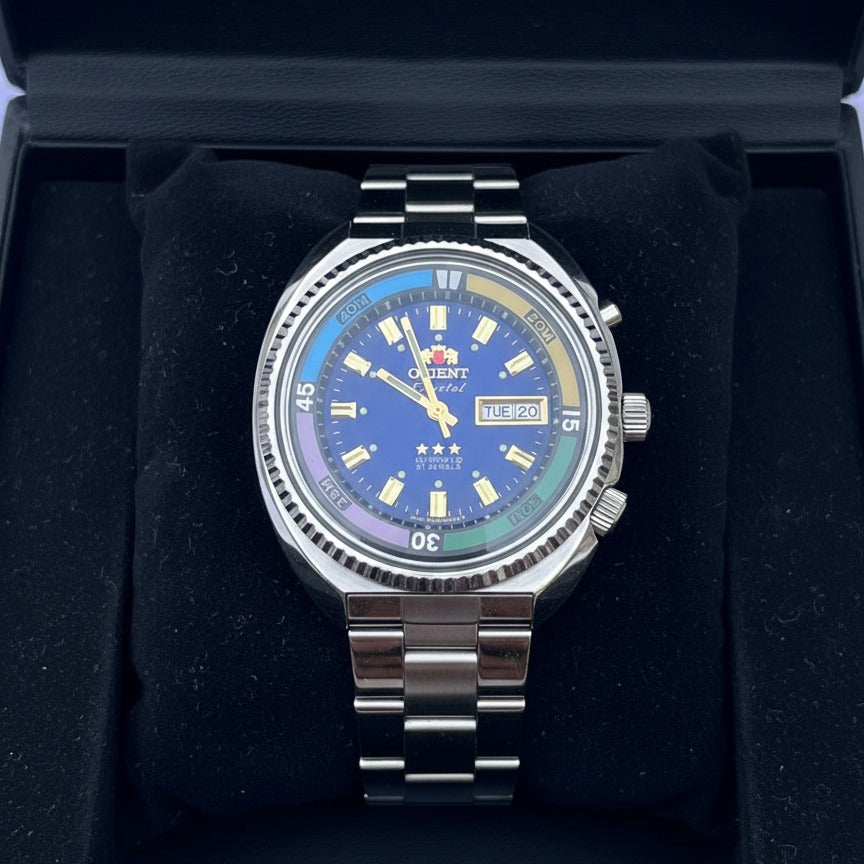 Dial Color: Deep Cobalt Blue with a multi-colored (rainbow) internal depth/timing bezel.