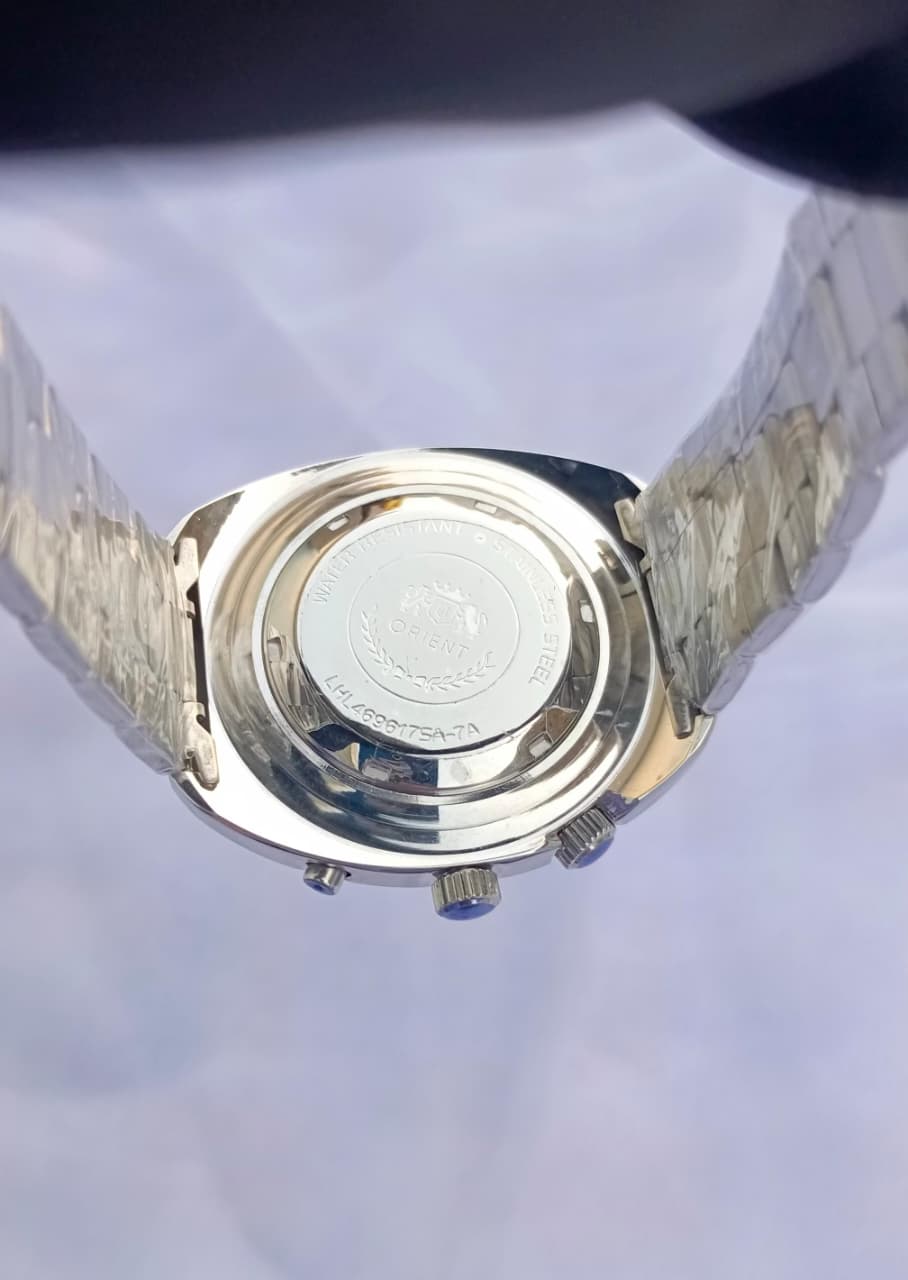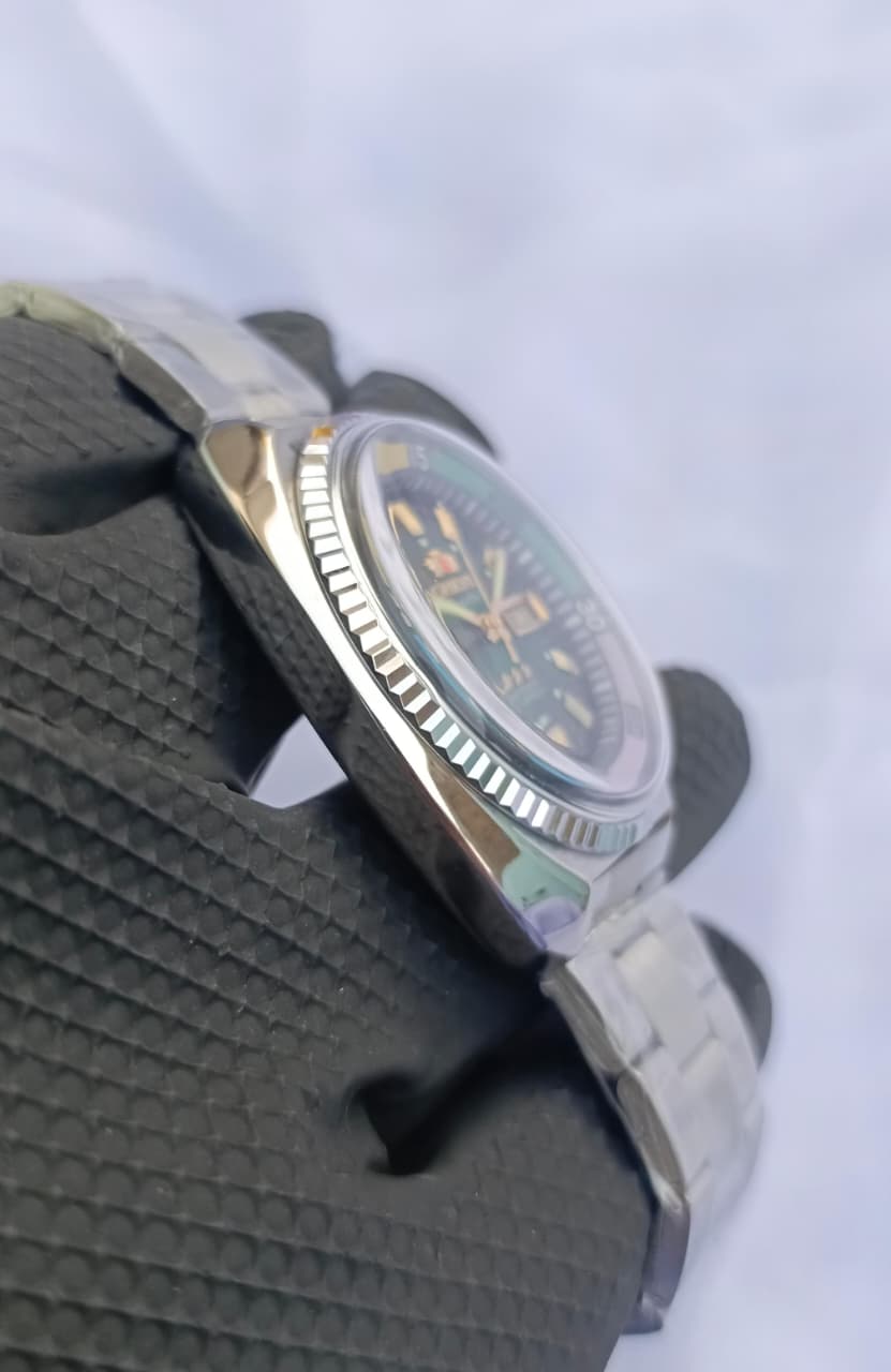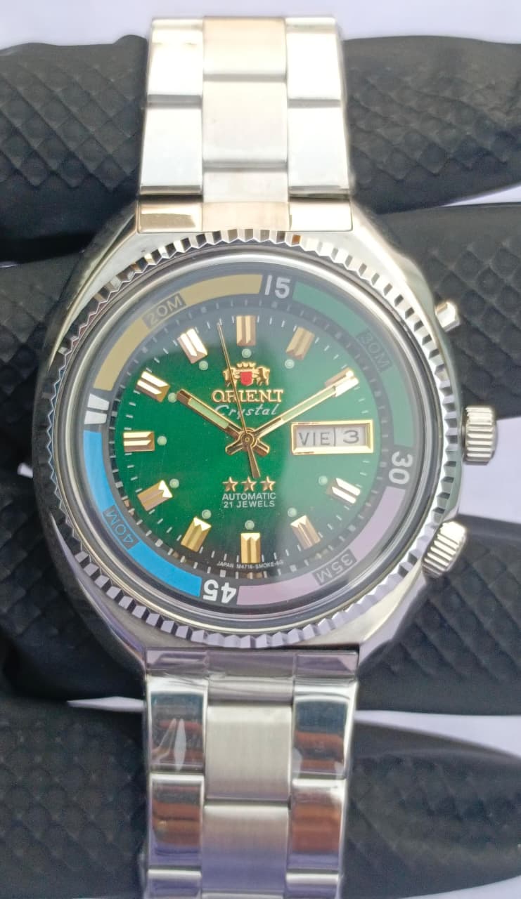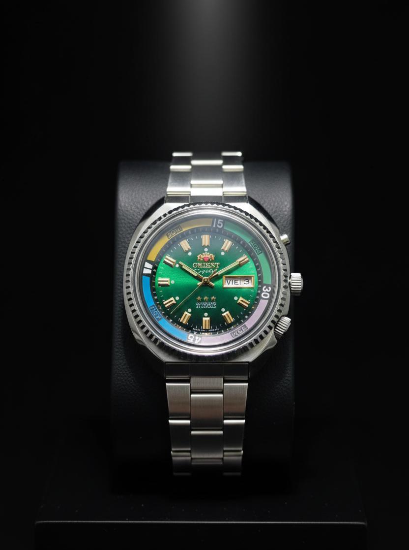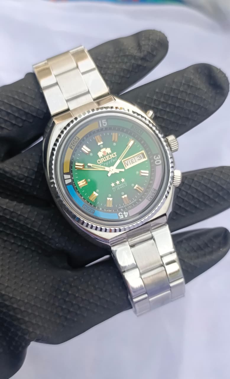 A vibrant and collectible Orient Crystal timepiece, showcasing the brand’s signature three-star heritage and reliable Japanese engineering. Its deep green dial, gold-tone markers, and eye-catching multi-color inner bezel create a bold statement, while the automatic movement ensures lasting mechanical performance.