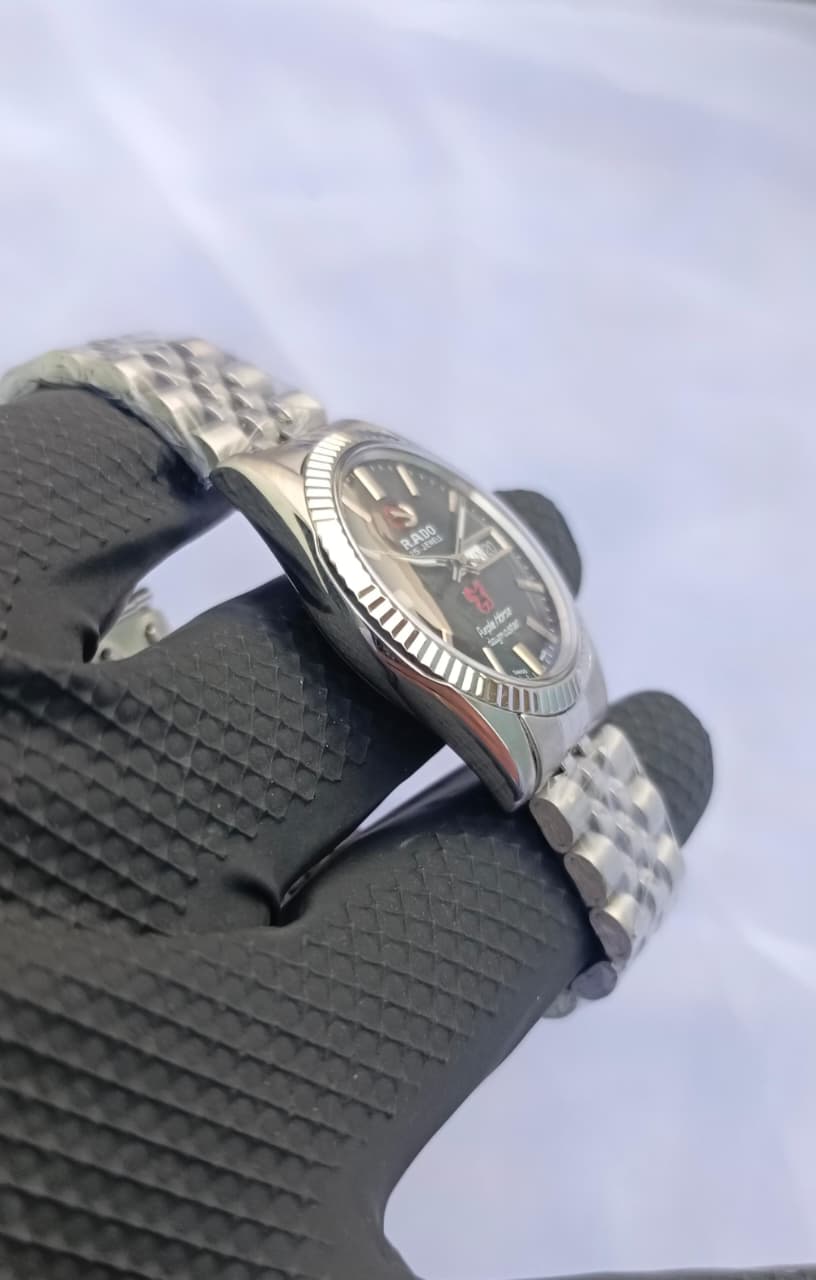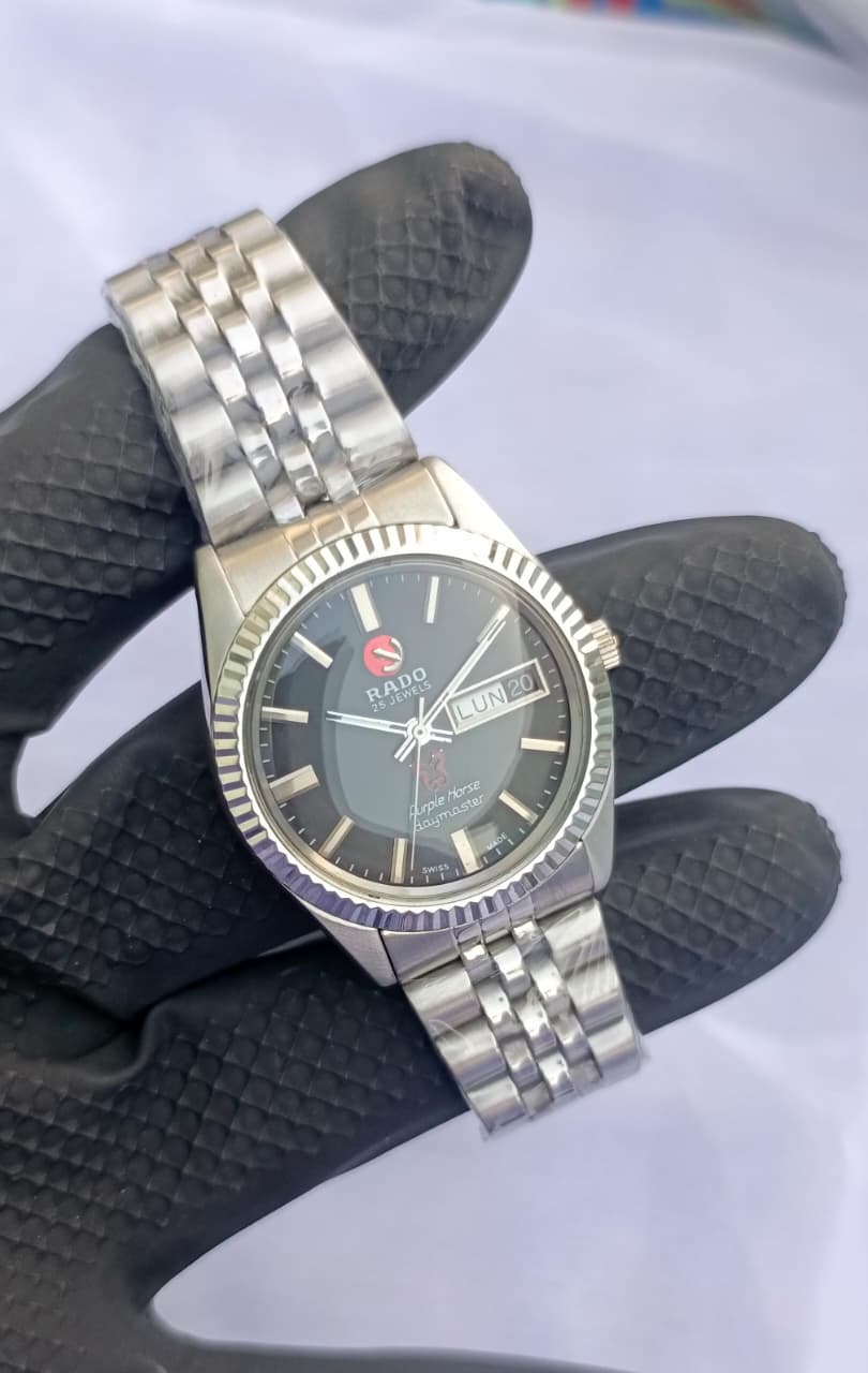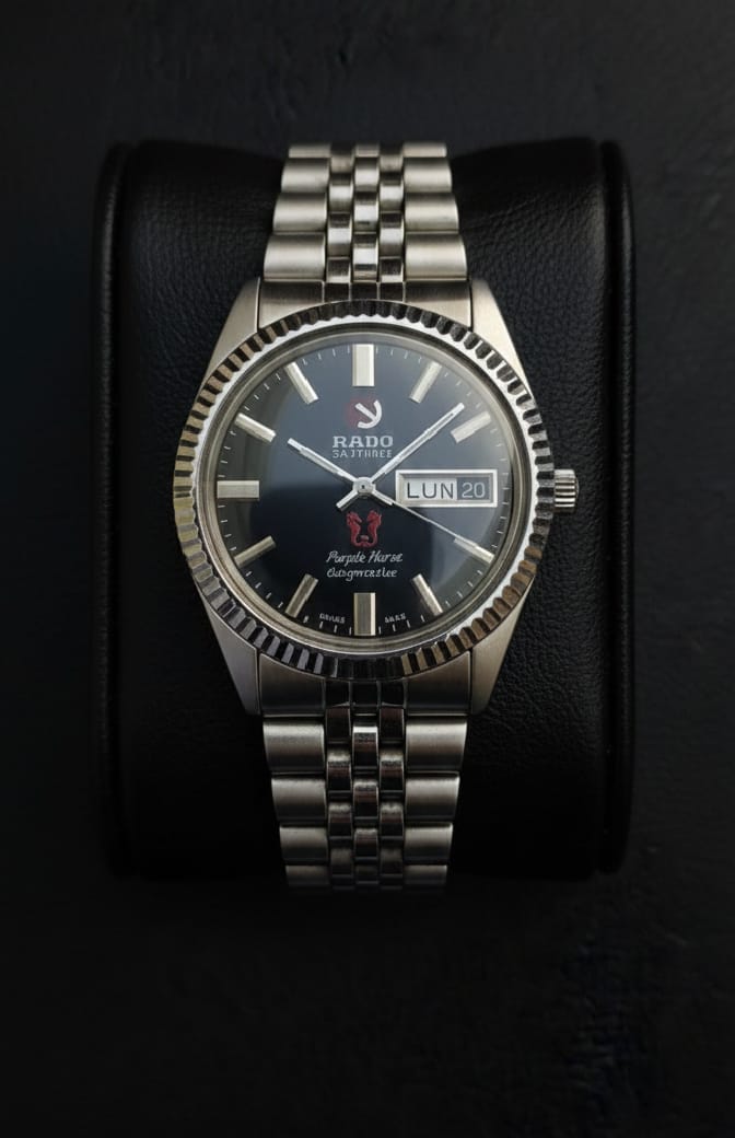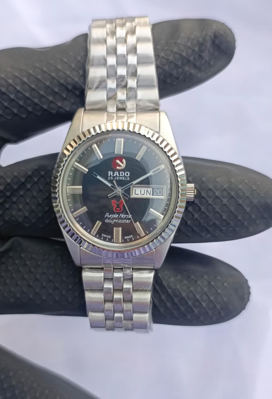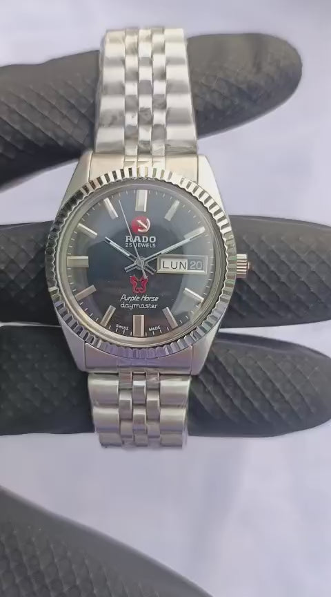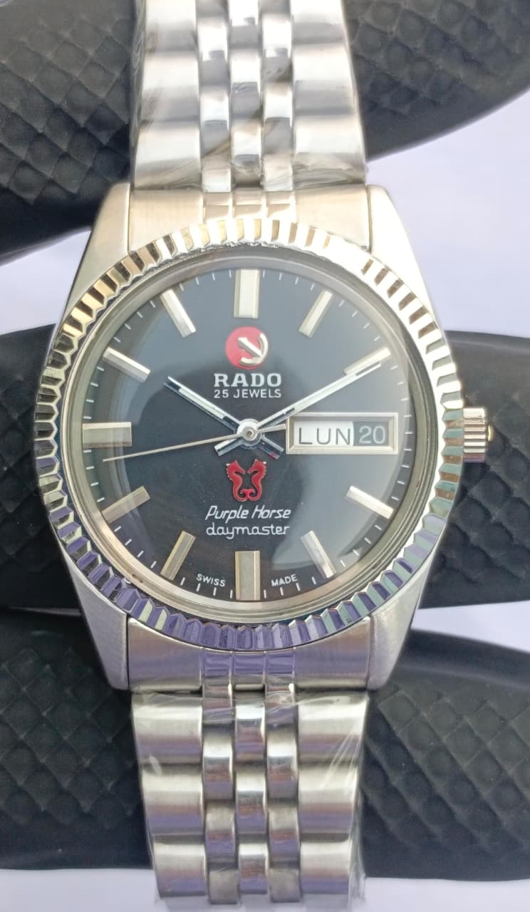 A refined classic from the iconic Purple Horse series, this Rado Daymaster brings together Swiss precision and vintage-inspired elegance. The striking black dial, highlighted by the signature red horse emblem, pairs seamlessly with a fluted bezel and a polished multi-link steel bracelet for a timeless and distinguished look.