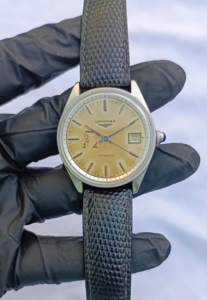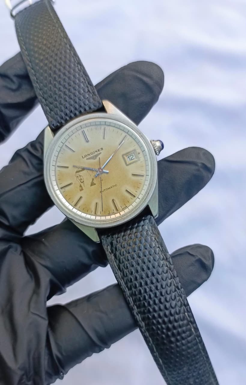 The most distinctive feature is the faded portrait of a monarch (most likely King Faisal bin Abdulaziz Al Saud of Saudi Arabia) on the dial near the 9 o'clock position. This indicates it was likely a commissioned piece or a presentation watch, making it historically significant and highly collectible. The dial features applied silver-tone baton hour markers, classic blued-steel hands, and a date window at 3 o'clock. It is fitted with an aftermarket black textured leather-style strap and features a blue cabochon on the crown. A truly unique and handsome piece for a collector of Longines or watches with historical royal provenance.